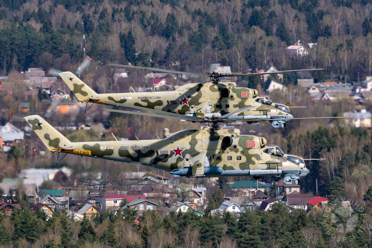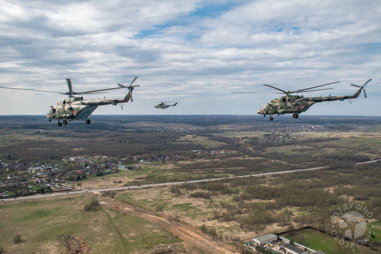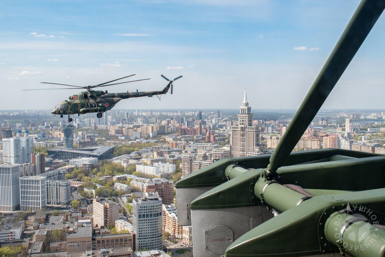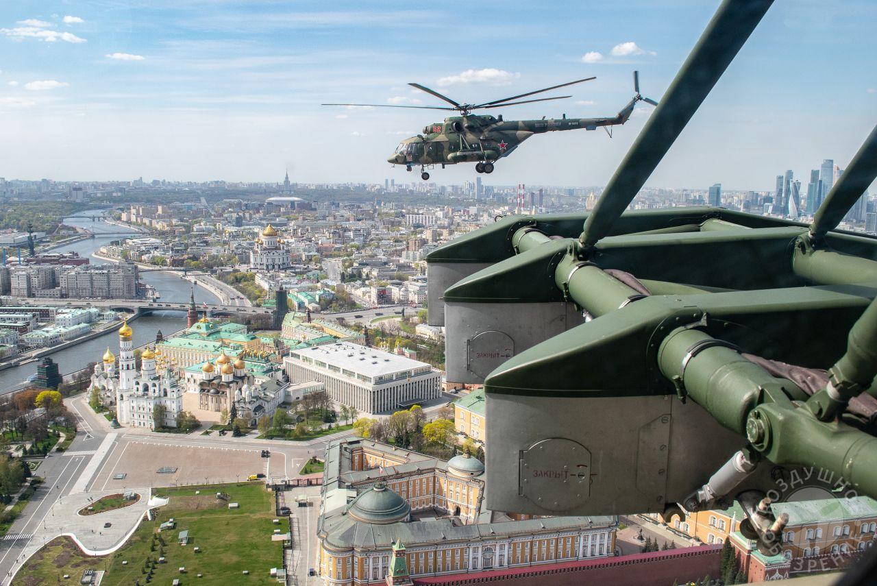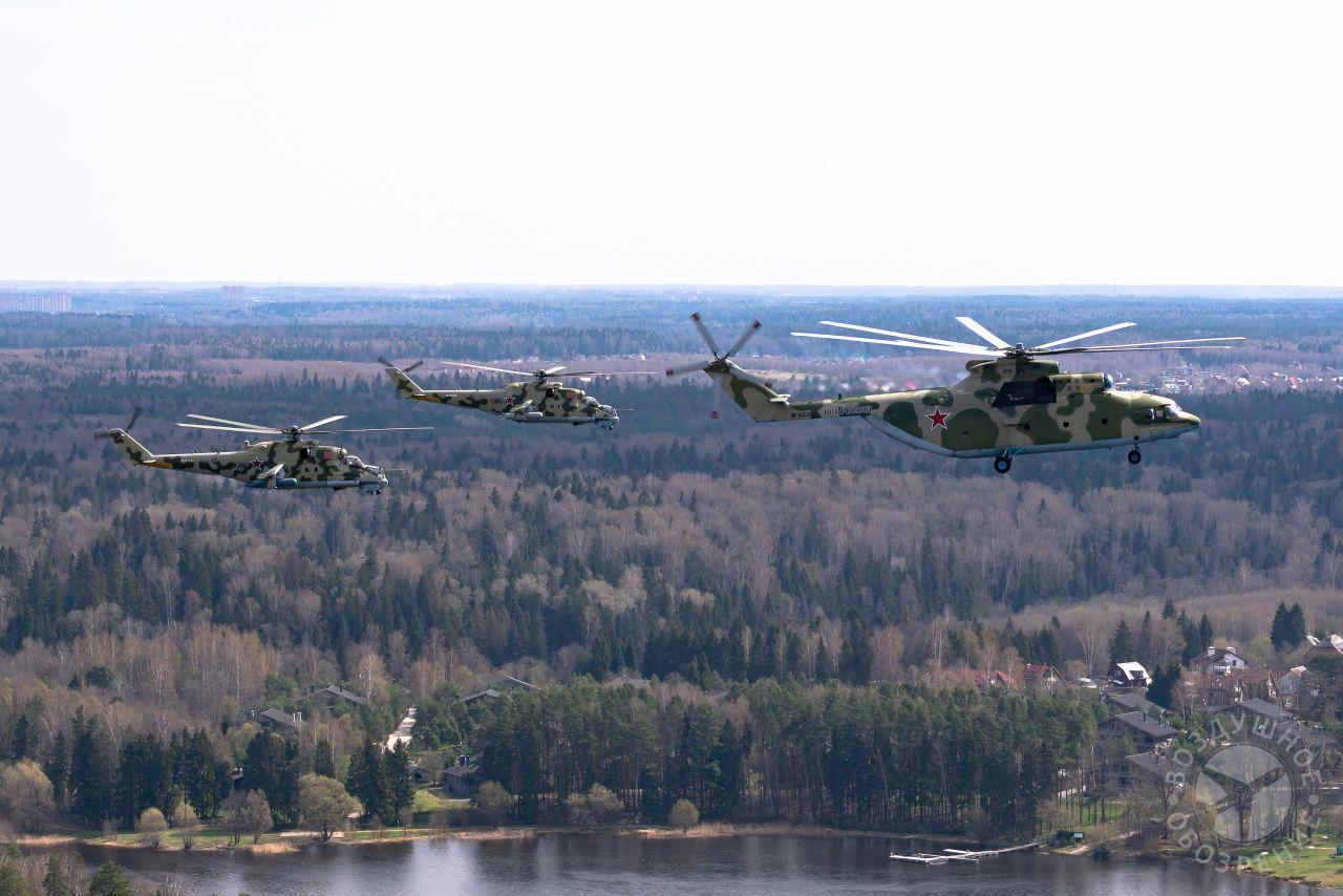 После того как весь строй поднялся в воздух, мы постепенно начали обходить его справа. Была возможность снять неспеша все борта. И вот наш борт добрался до первой группы. Ведущий Ми-26 и пара ведомых Ми-24 шли красиво и плотно. За ними мелькали леса, поля и дачные поселки.Где-то между Митино и Красногорском резервные борта получают команду на смену курса и возврат на базу. Удается сделать несколько красивых фото резервных бортов на фоне улетающих на Москву вертолетов, но на этом программа съемок не заканчивается. Постепенно к нашему Ми-26 подходят Ми-24, Ми-28, Ка-52 и начинают словно позировать.Из-за размеров и массы Ми-26, в нем не так чувствуются перегрузки, как в Ми-8, но зато вибрации ощутимее. Хотя, и с ними можно справляться, чтобы не мешали съемке.