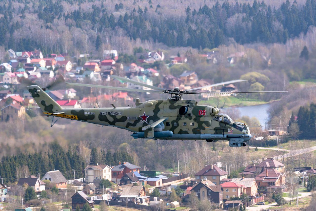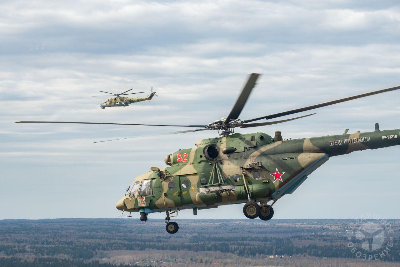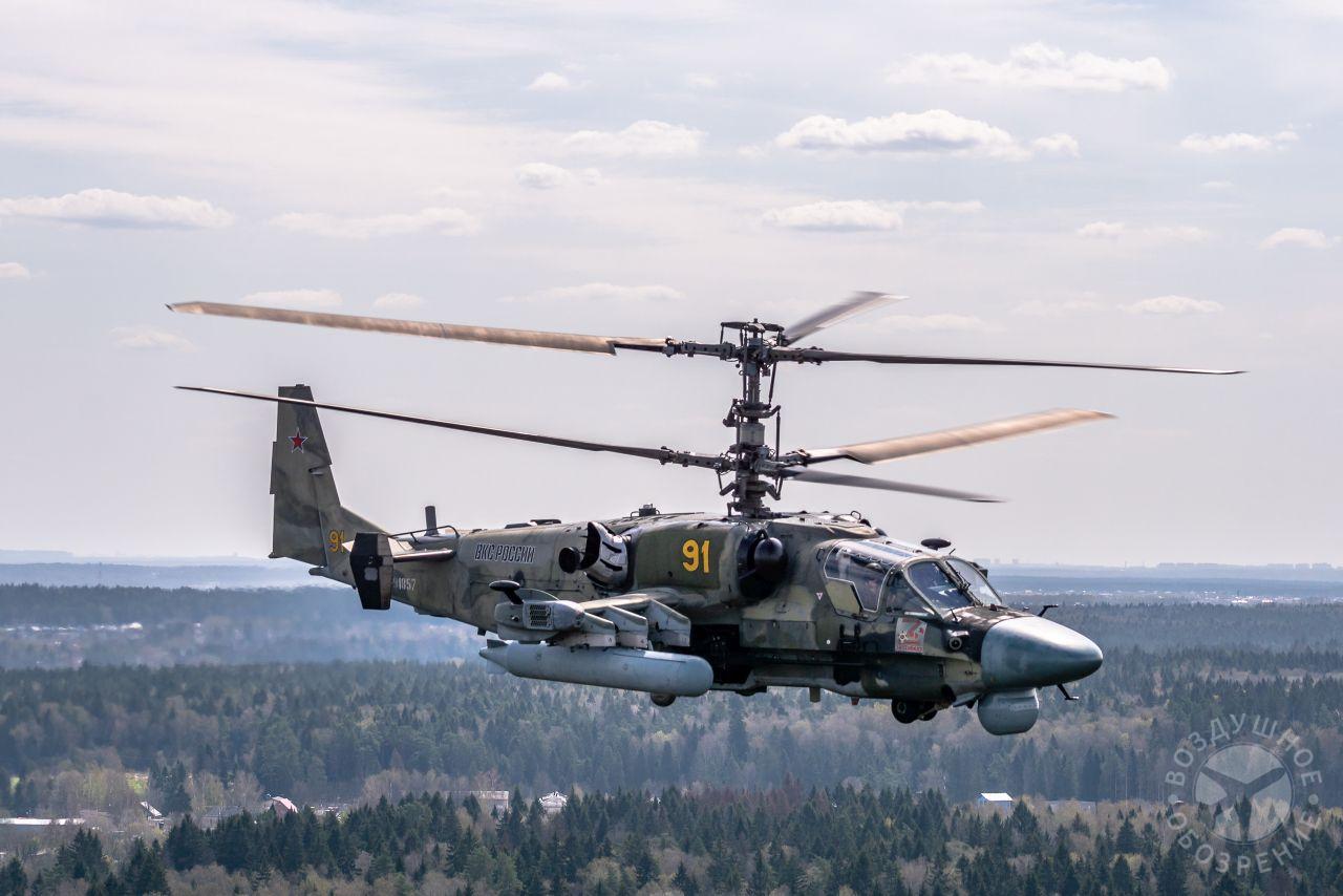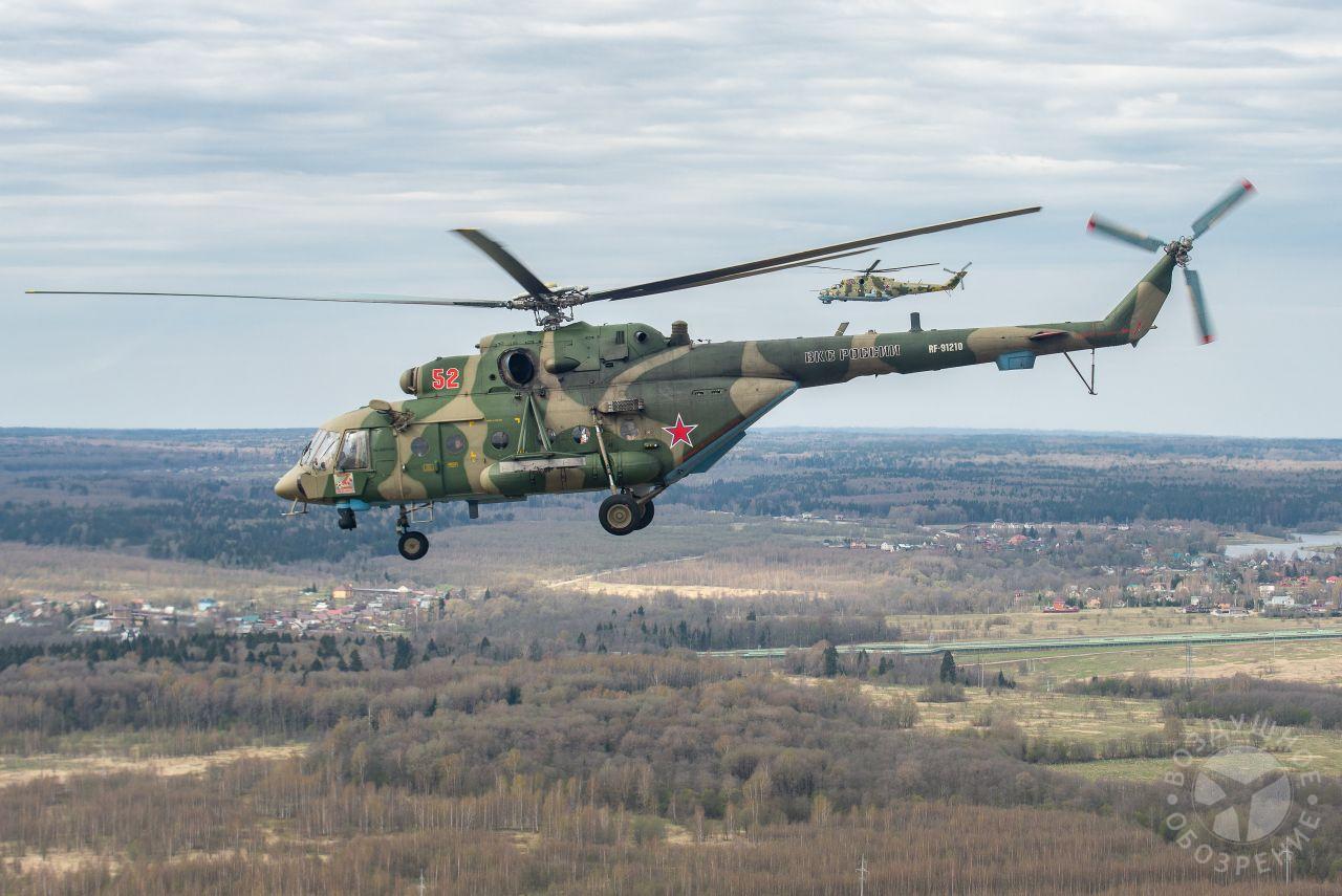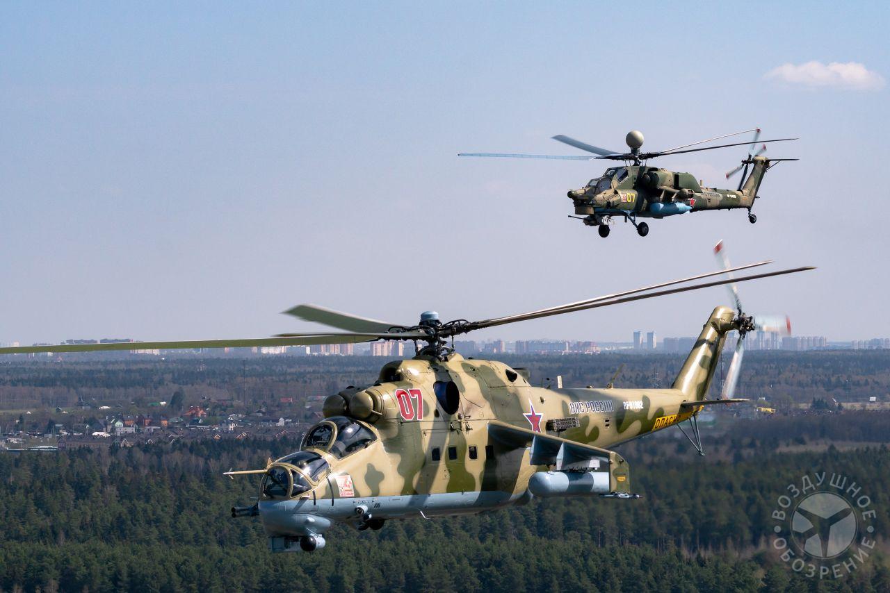 После того как весь строй поднялся в воздух, мы постепенно начали обходить его справа. Была возможность снять неспеша все борта. И вот наш борт добрался до первой группы. Ведущий Ми-26 и пара ведомых Ми-24 шли красиво и плотно. За ними мелькали леса, поля и дачные поселки.Где-то между Митино и Красногорском резервные борта получают команду на смену курса и возврат на базу. Удается сделать несколько красивых фото резервных бортов на фоне улетающих на Москву вертолетов, но на этом программа съемок не заканчивается. Постепенно к нашему Ми-26 подходят Ми-24, Ми-28, Ка-52 и начинают словно позировать.Из-за размеров и массы Ми-26, в нем не так чувствуются перегрузки, как в Ми-8, но зато вибрации ощутимее. Хотя, и с ними можно справляться, чтобы не мешали съемке.
