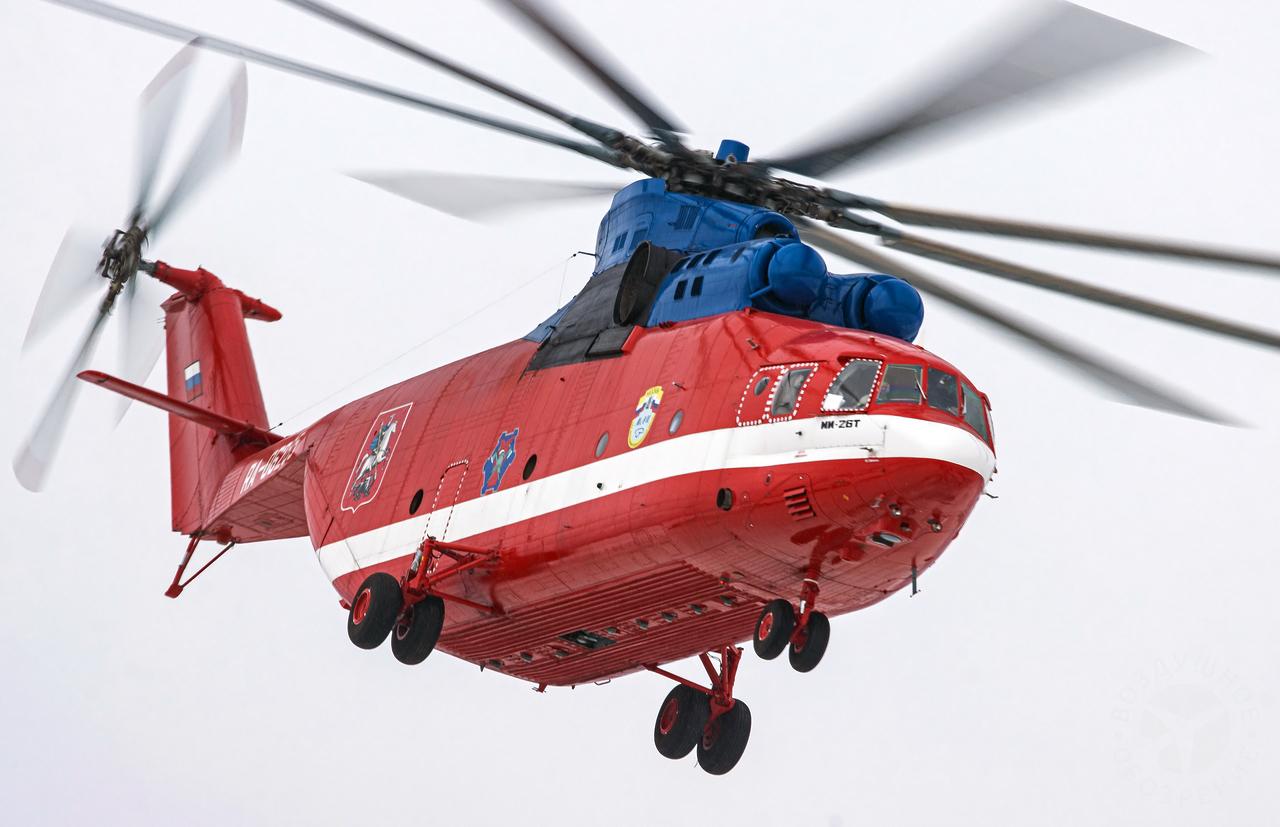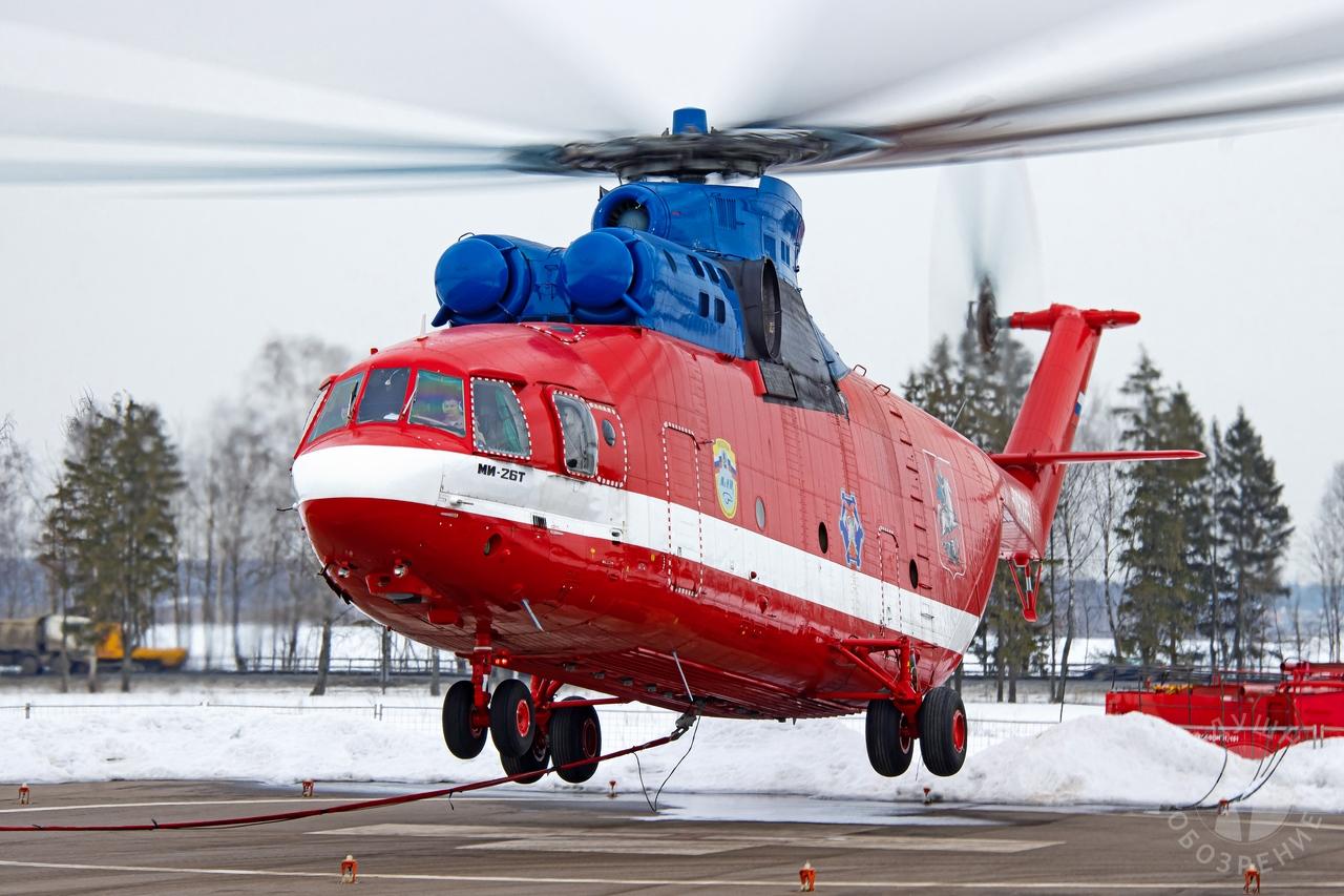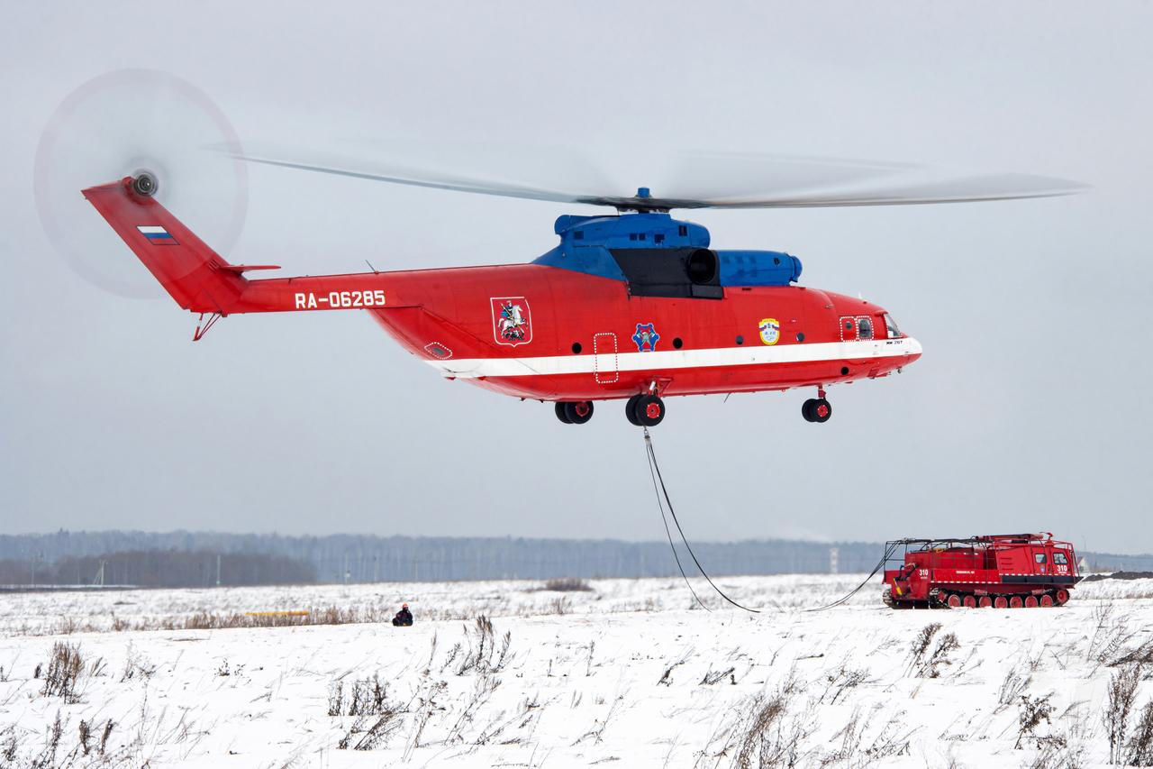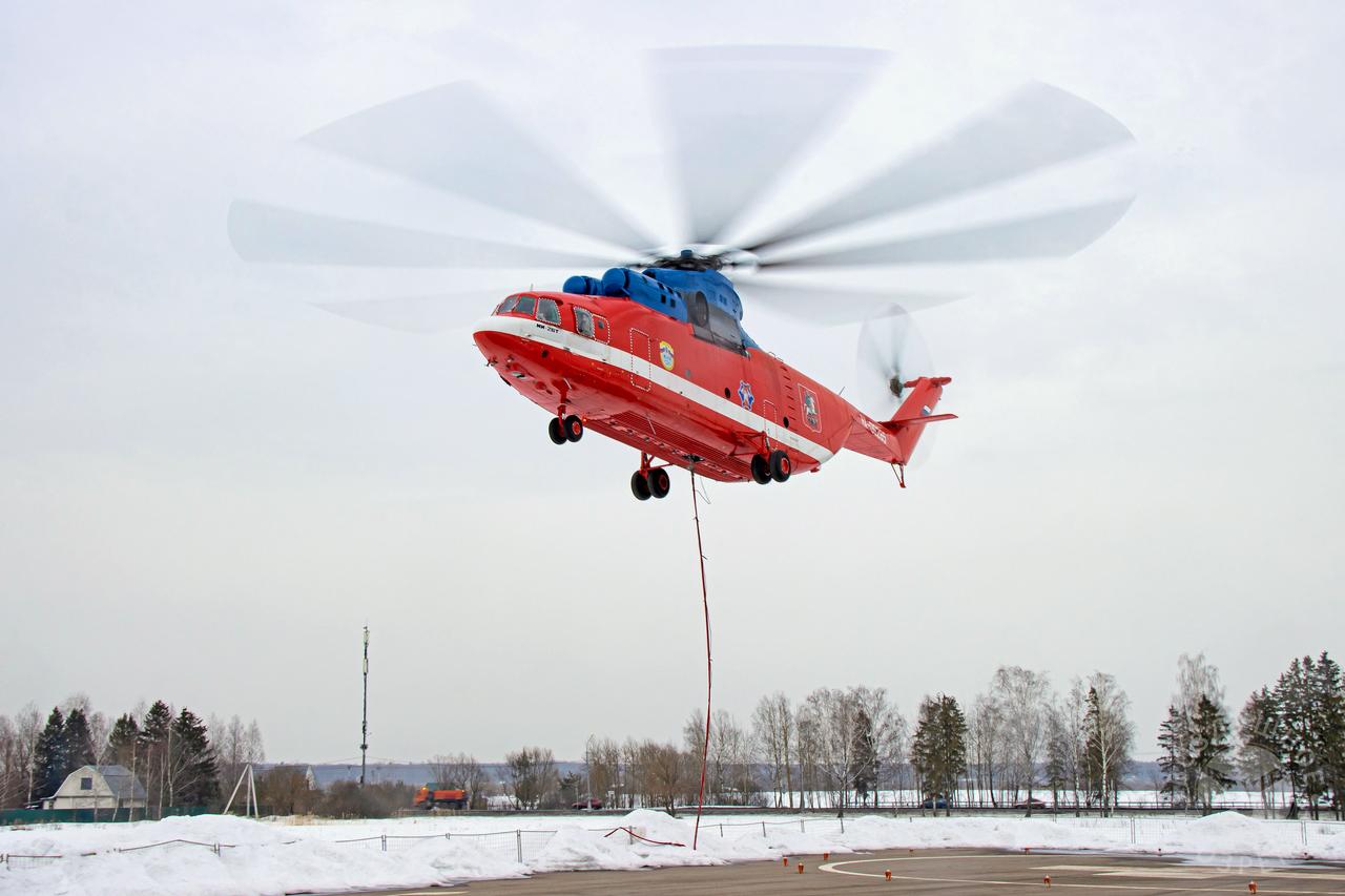 Самый большой в мире транспортный вертолет Ми-26 доставил к месту ЧС крупногабаритный снегоболотоход на внешней подвеске и может применяться для тушения пожаров при помощи водосливного устройства, которое вмещает сразу 15 тонн воды.