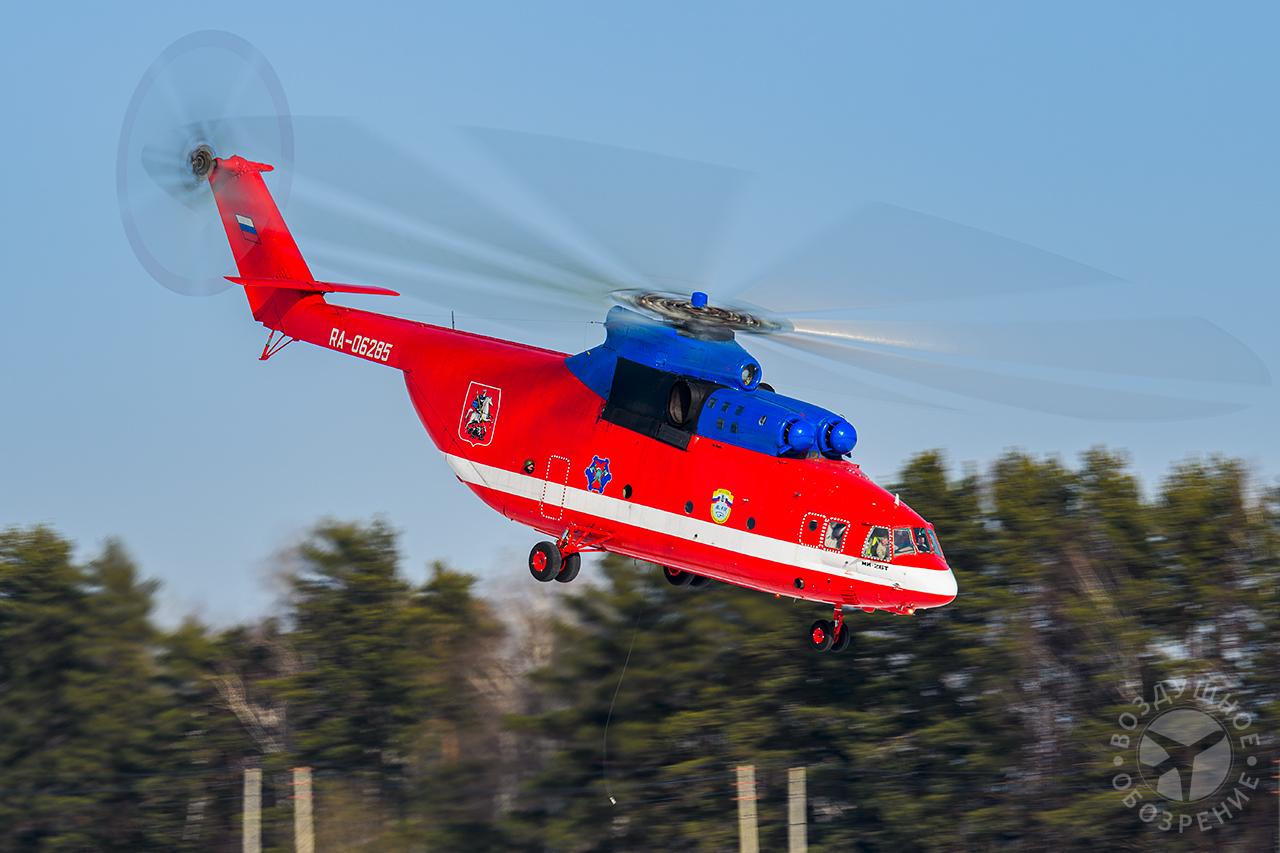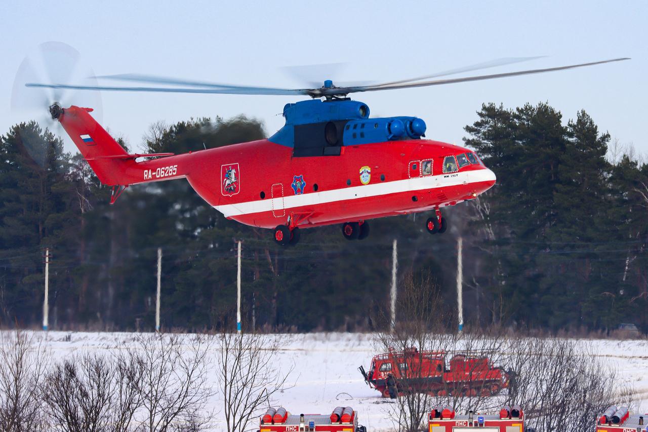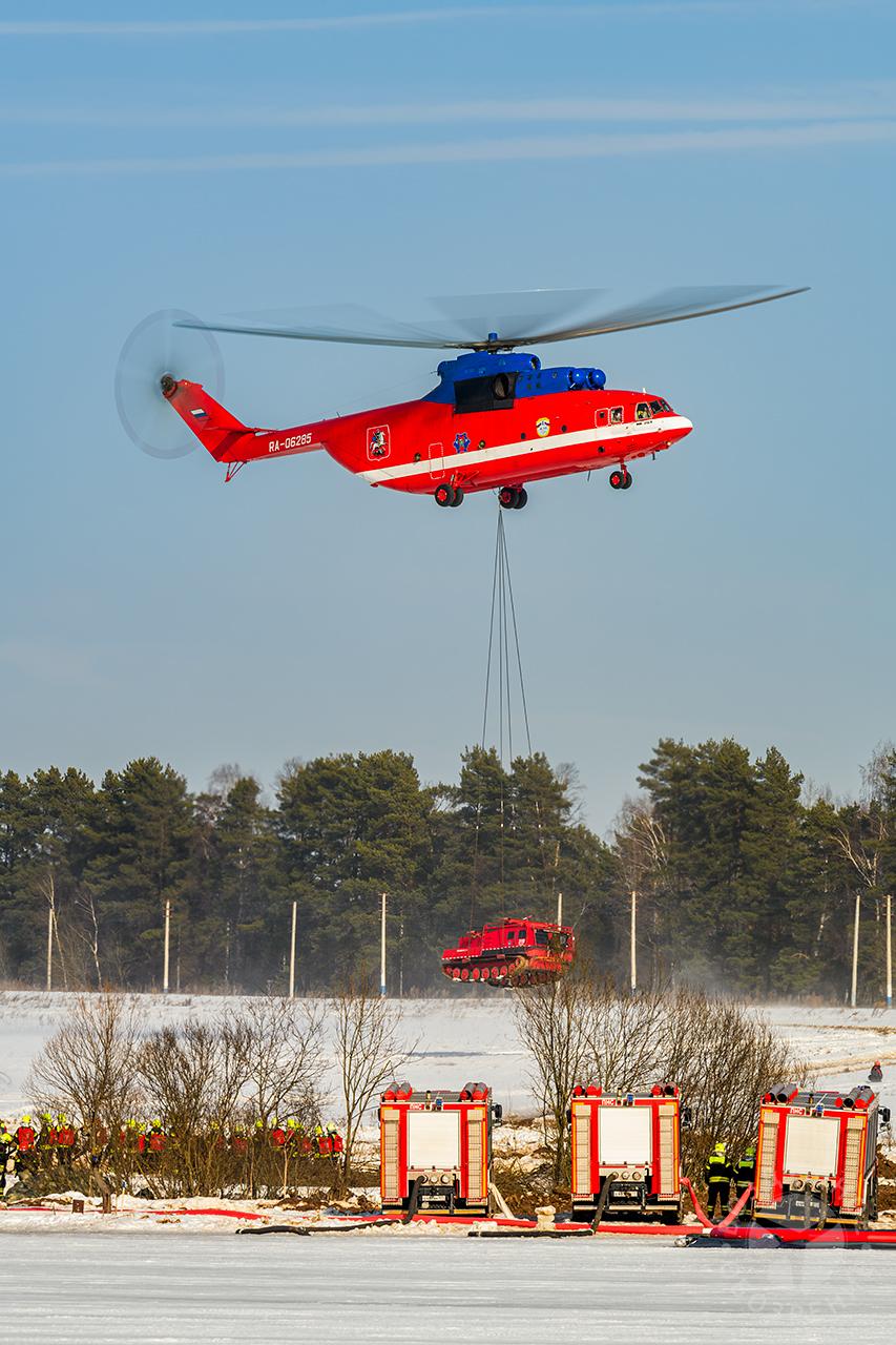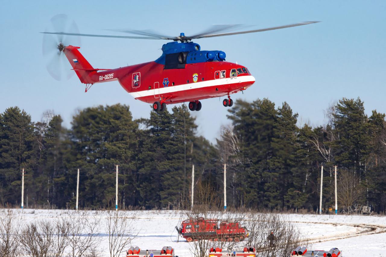 Самый большой в мире транспортный вертолет Ми-26 доставил к месту ЧС крупногабаритный снегоболотоход на внешней подвеске и может применяться для тушения пожаров при помощи водосливного устройства, которое вмещает сразу 15 тонн воды.