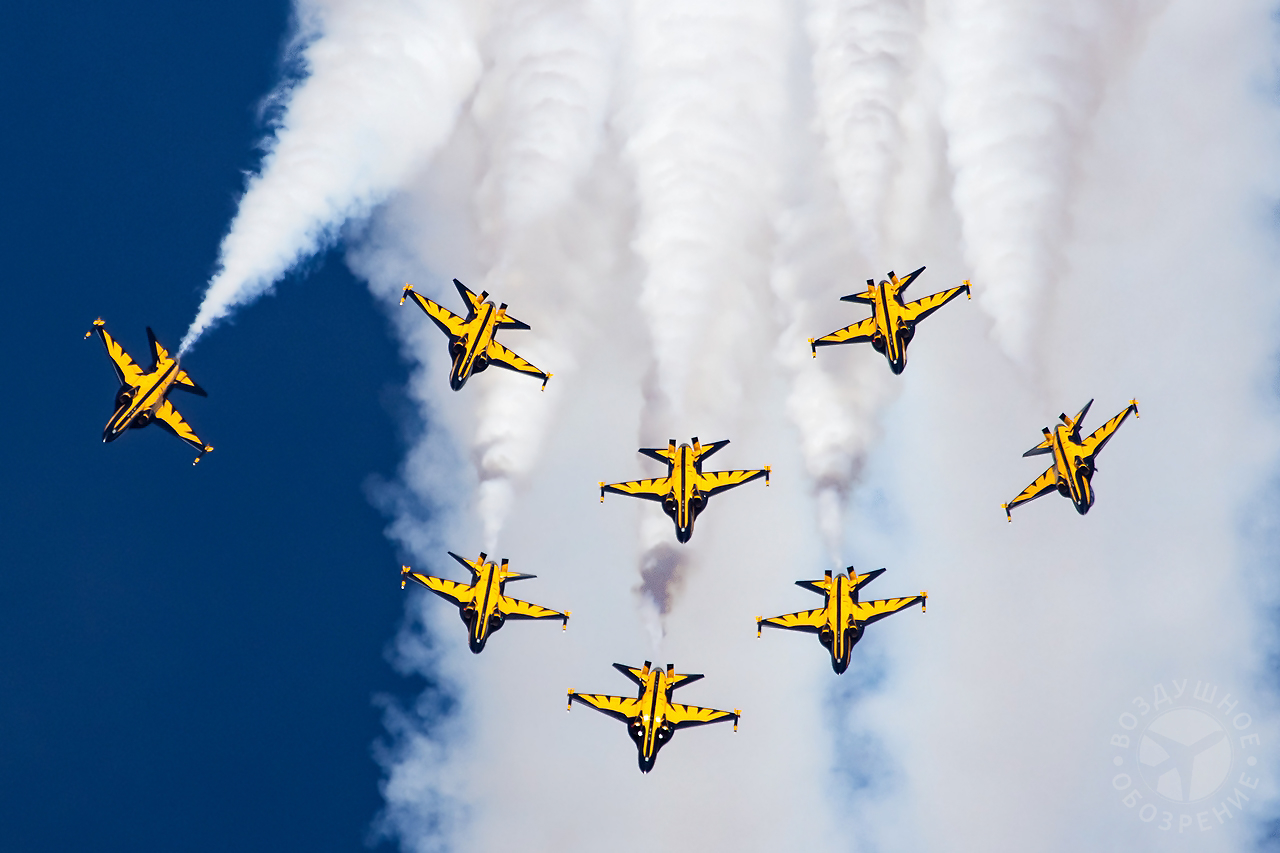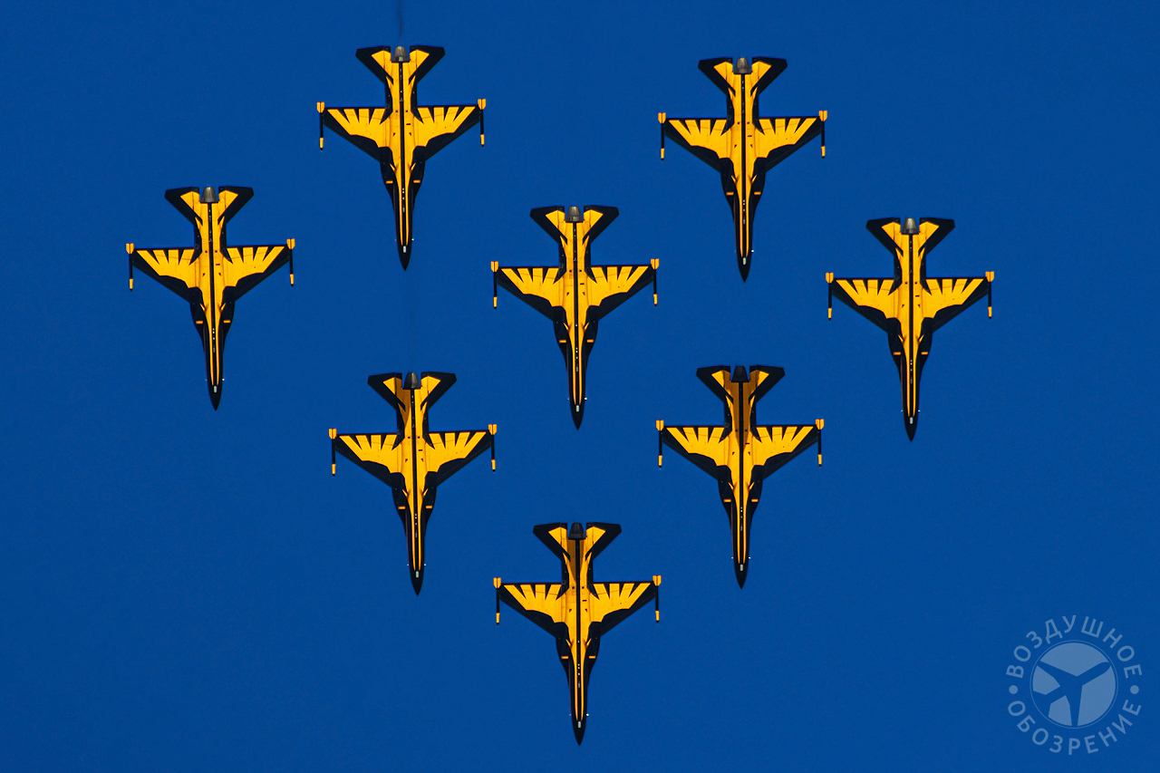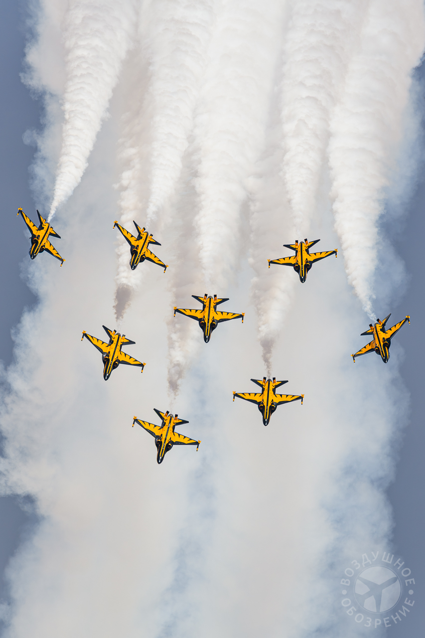 «Маневр кобры» — самолёты летят прямо вверх в воздух, а затем внезапно опускают нос, выполняя резкий поворот и уходя от аудитории.