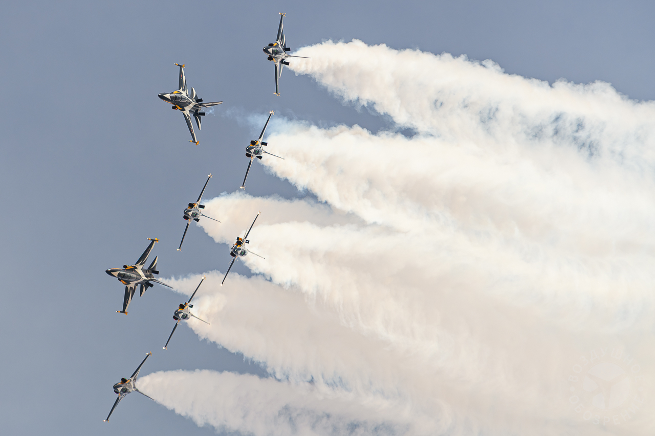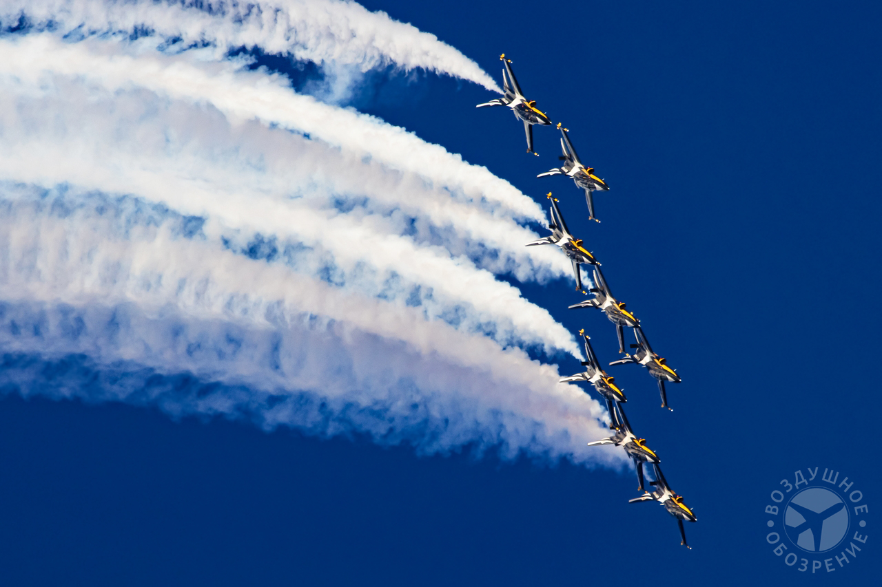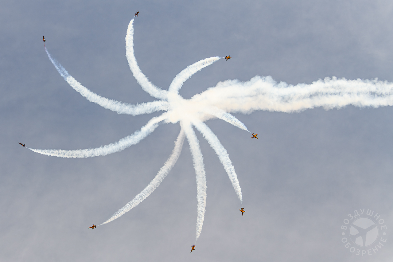 Группа выполняет около 30 аэробатических манёвров, включая петли, бочки и вращения.