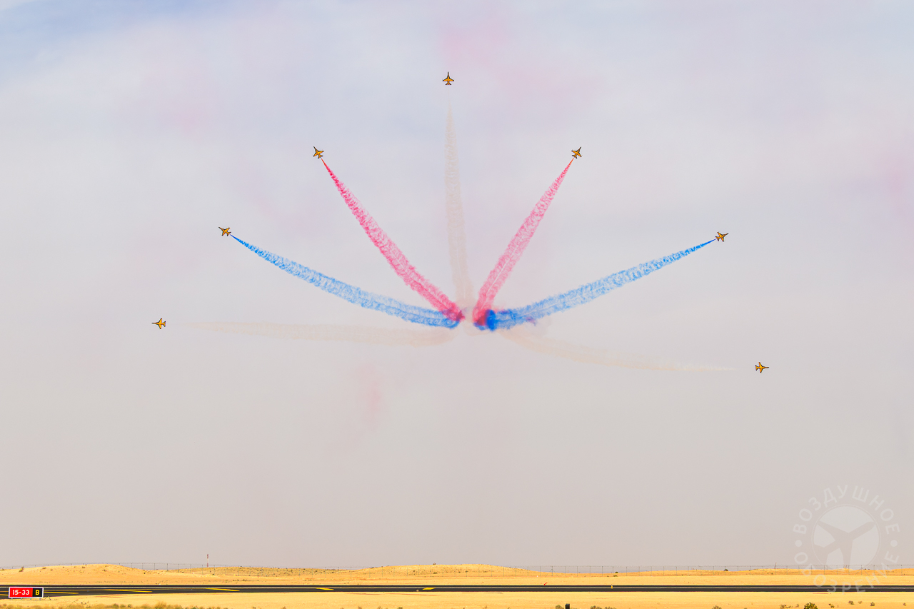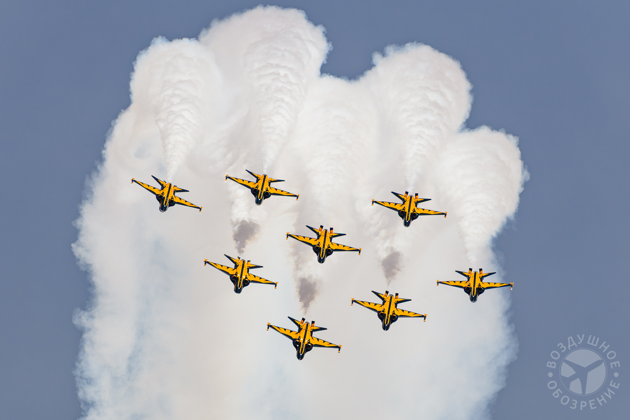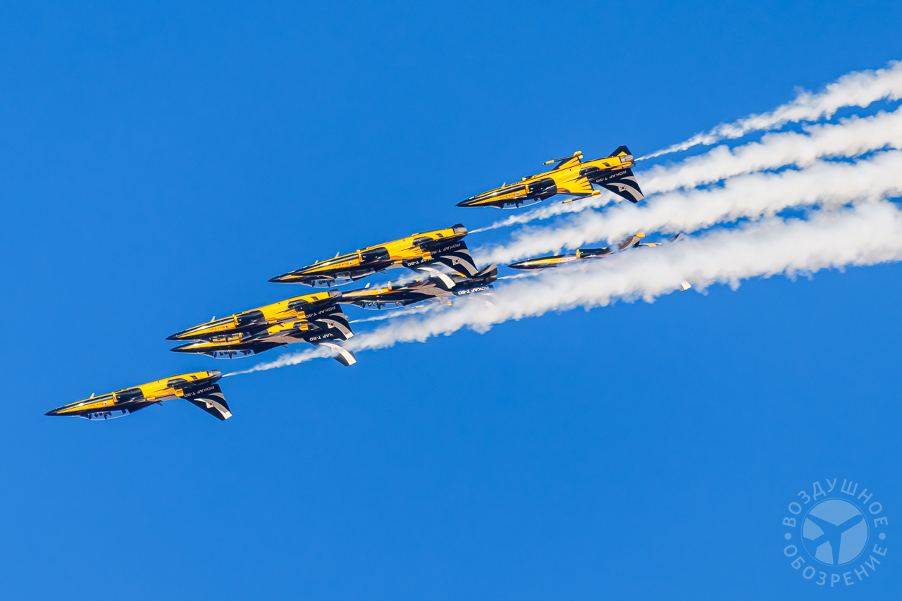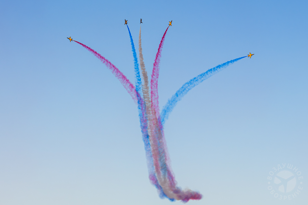 Группа выполняет около 30 аэробатических манёвров, включая петли, бочки и вращения.