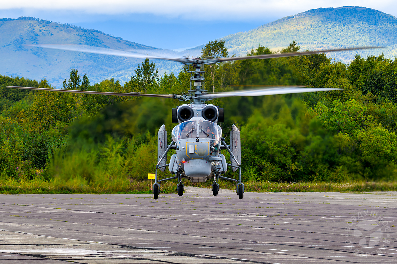 Пара транспортно-боевых вертолётов Ка-29 морской авиации выполнила задачи по огневому поражению десанта и кораблей условного противника. На авиационном морском полигоне вертолёты нанесли удар неуправляемыми авиационными ракетами и авиационными пушками по мишенной позиции, имитирующей малоразмерные надводные корабли.