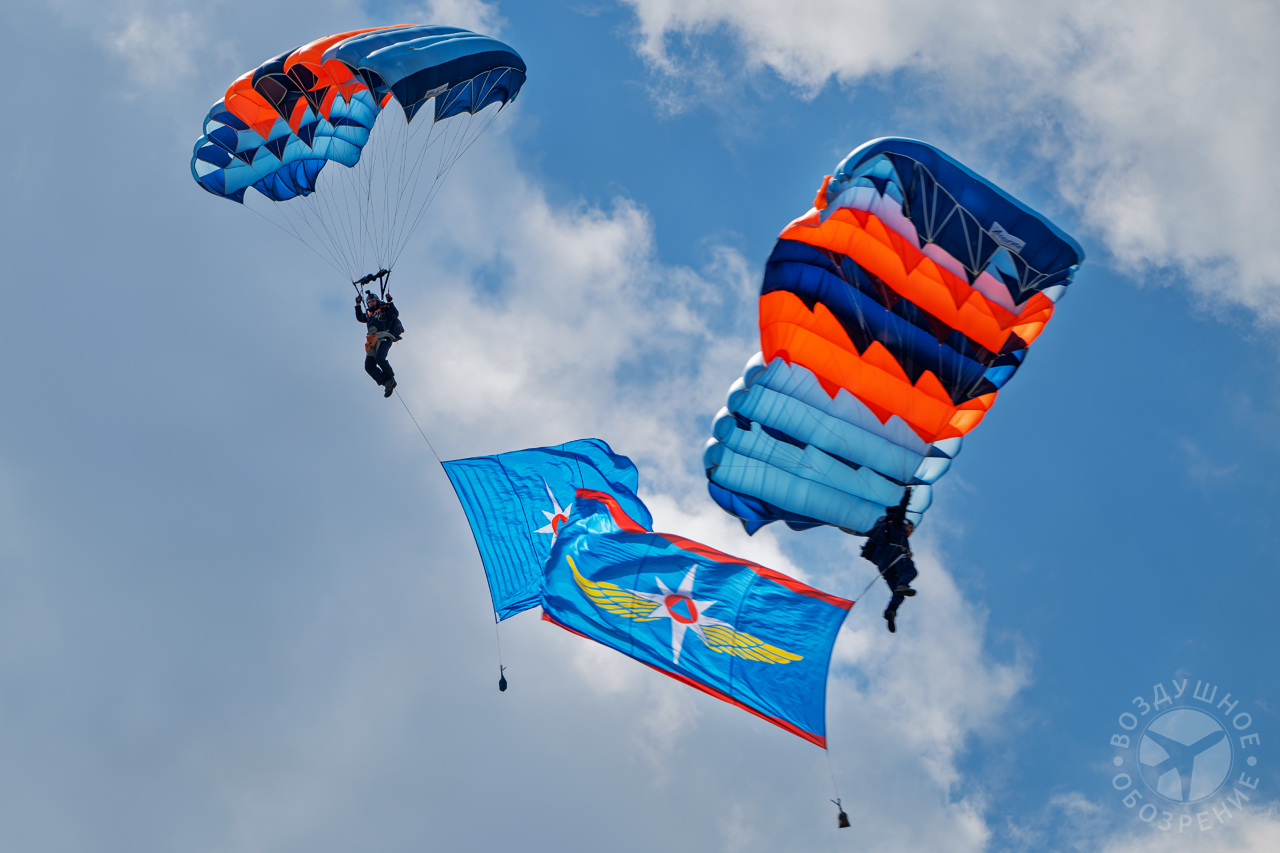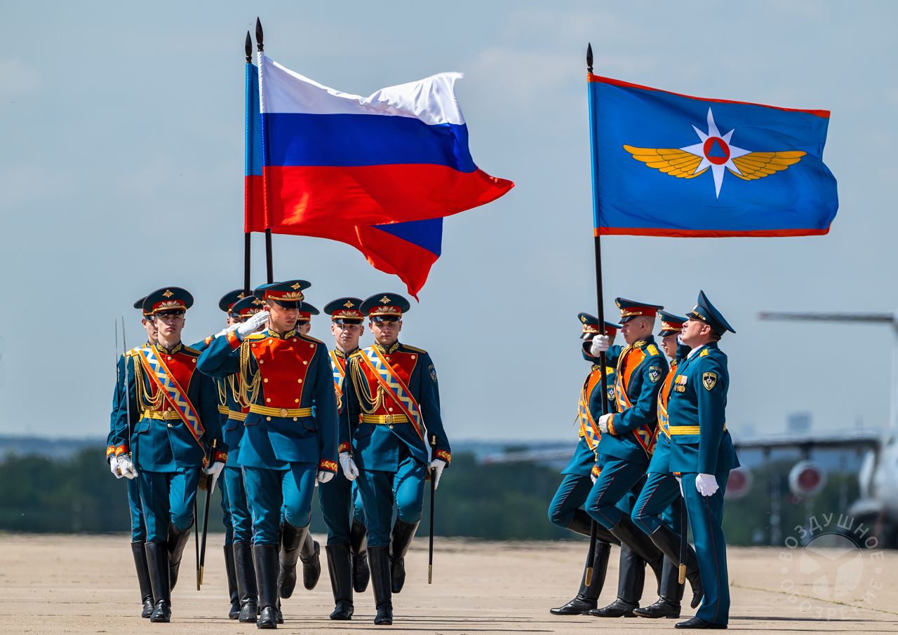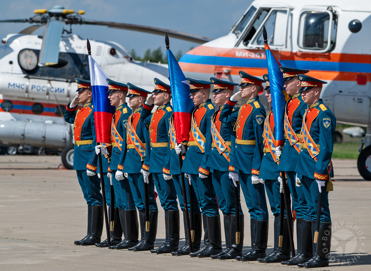 Были представлены самолеты Ил-76, Суперджет и Ан-148, вертолеты Ми-26 и Ми-8, Ка-32, Бк-117, Бо-105, а также беспилотники разных типов и другая спецтехника. Под музыкальное сопровождение показательного оркестра МЧС России экипажи Ил-76, Ми-8 и Бо-105 поднялись в небо. Динамический показ авиационной техники завершился десантированием личного состава.