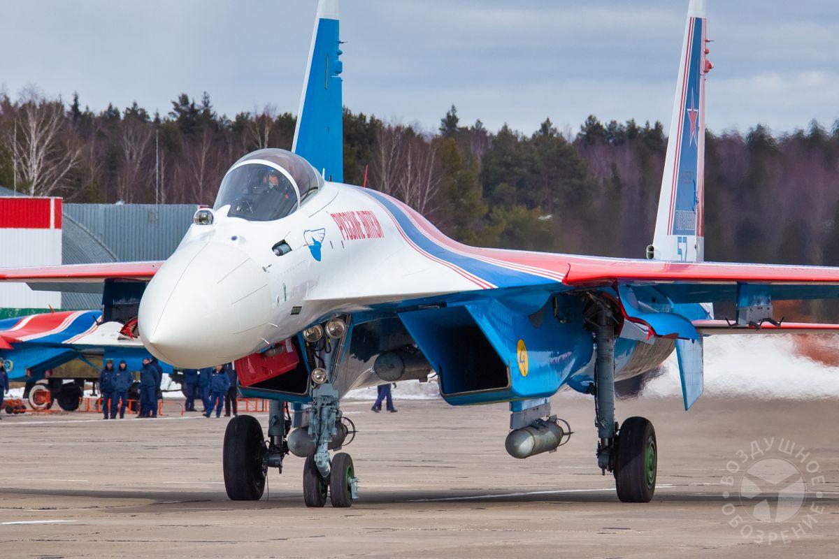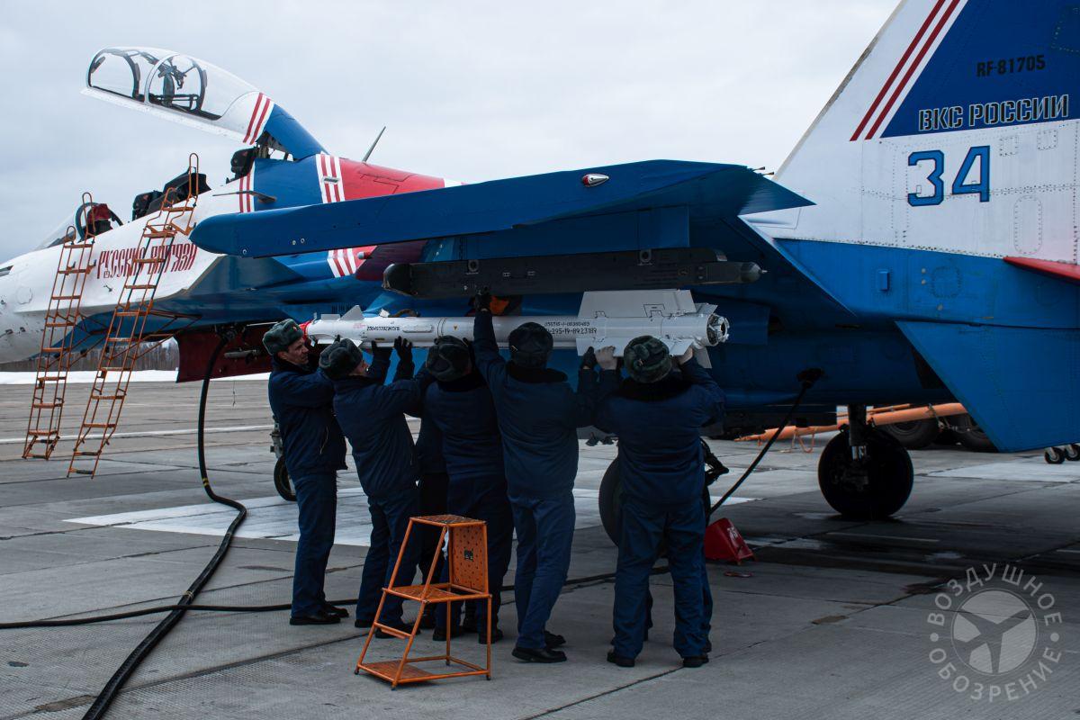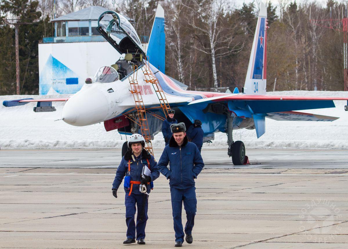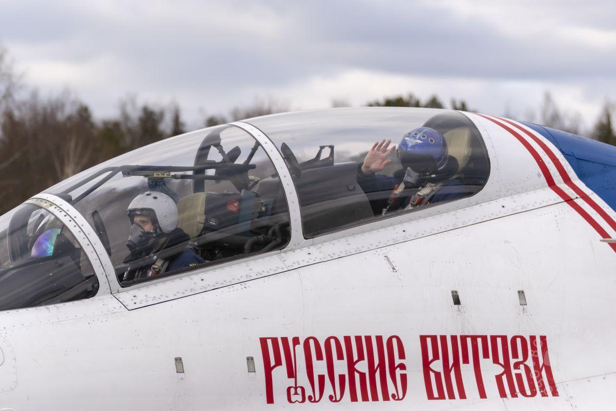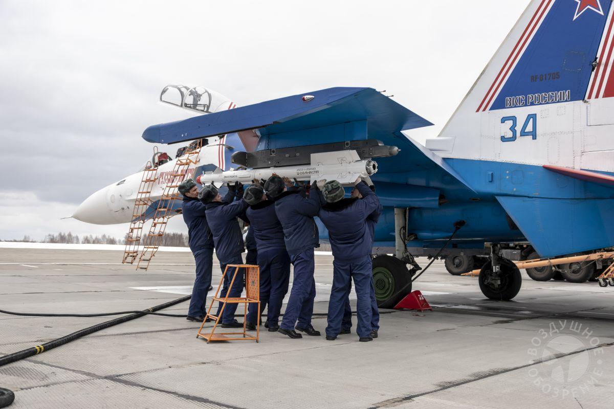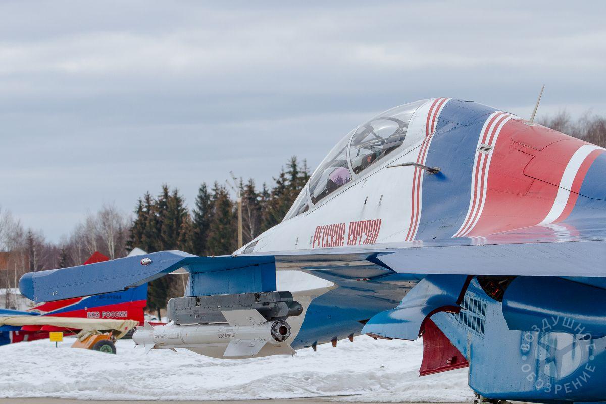 На аэродроме Кубинка прошли плановые полёты экипажей авиационных групп высшего пилотажа «Русские Витязи» и «Стрижи», входе которых лётчики отработали практические пуски управляемых ракет «Воздух-Воздух».
