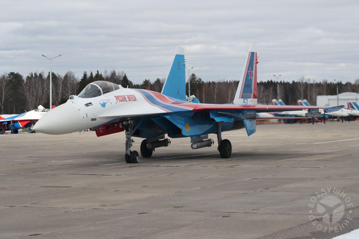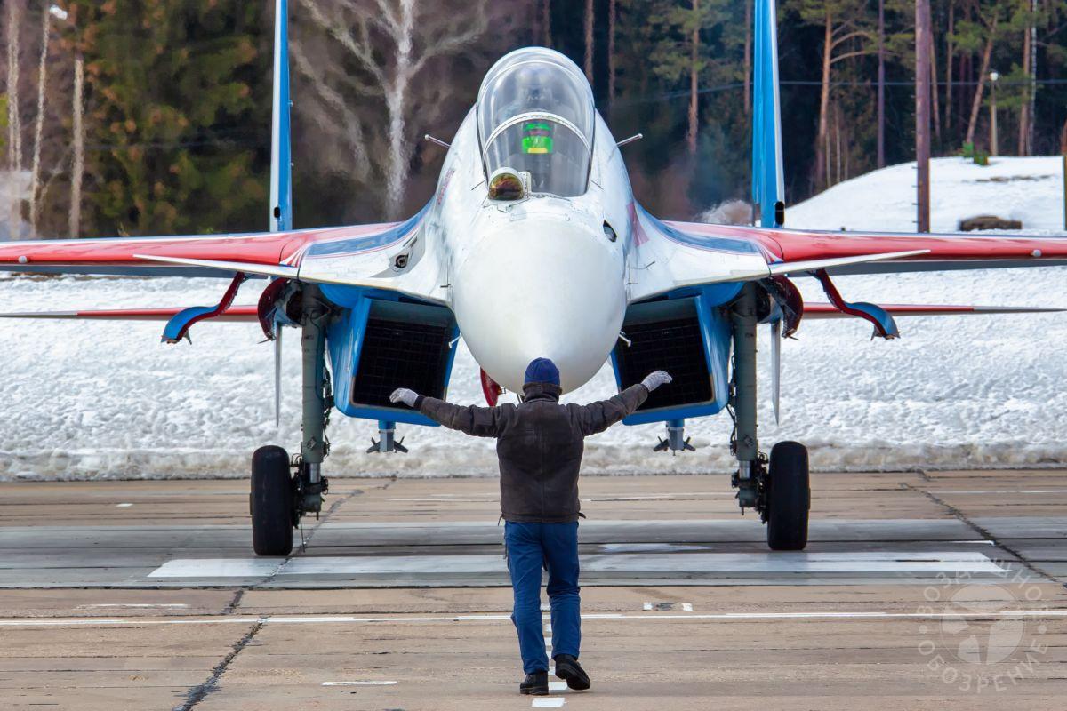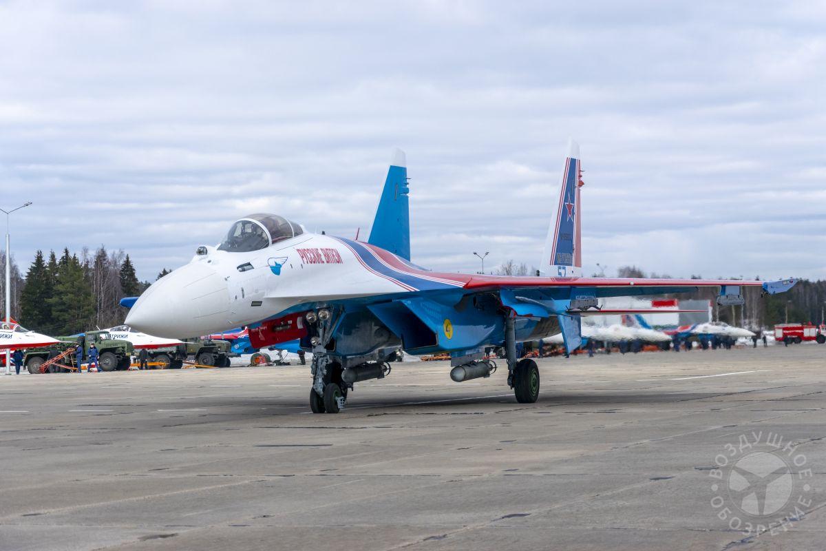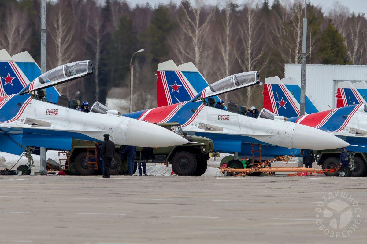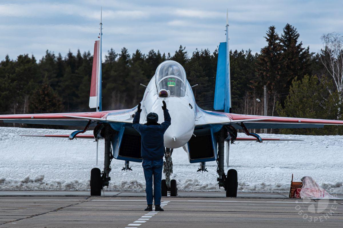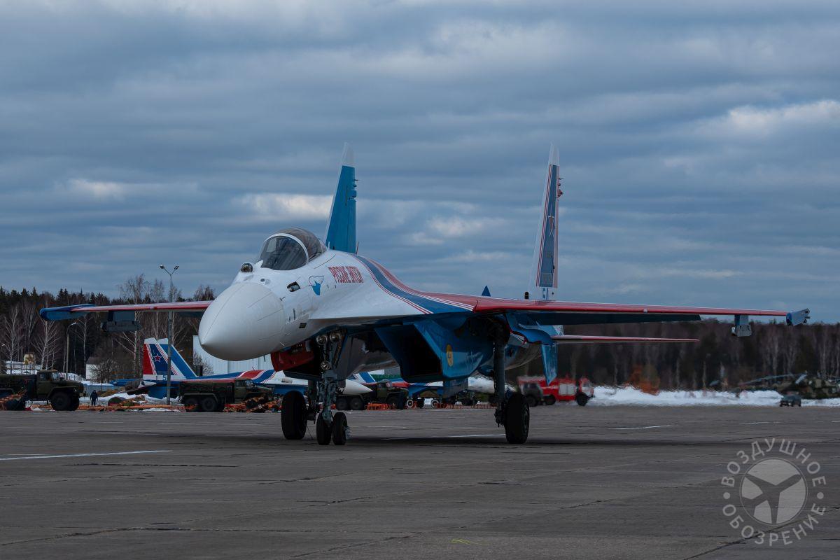 На аэродроме Кубинка прошли плановые полёты экипажей авиационных групп высшего пилотажа «Русские Витязи» и «Стрижи», входе которых лётчики отработали практические пуски управляемых ракет «Воздух-Воздух».