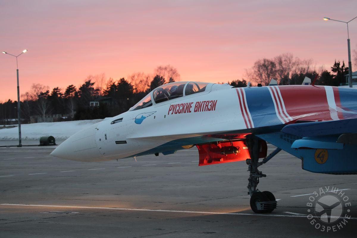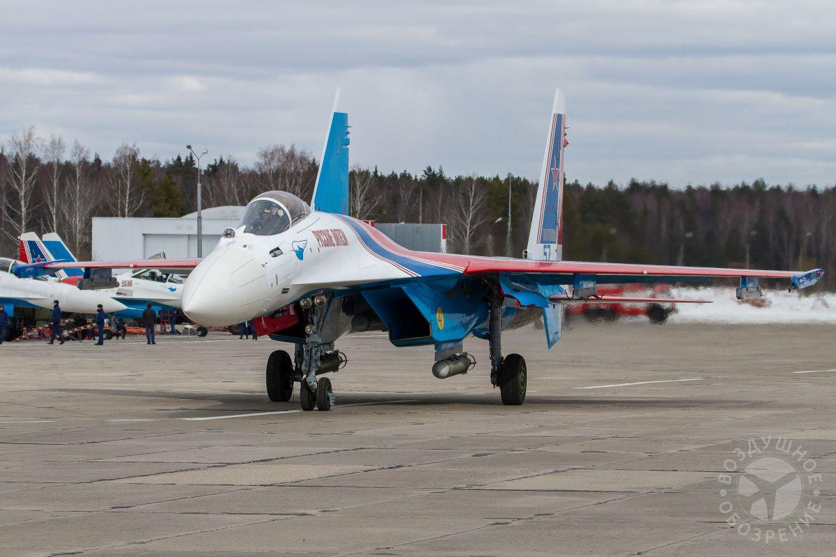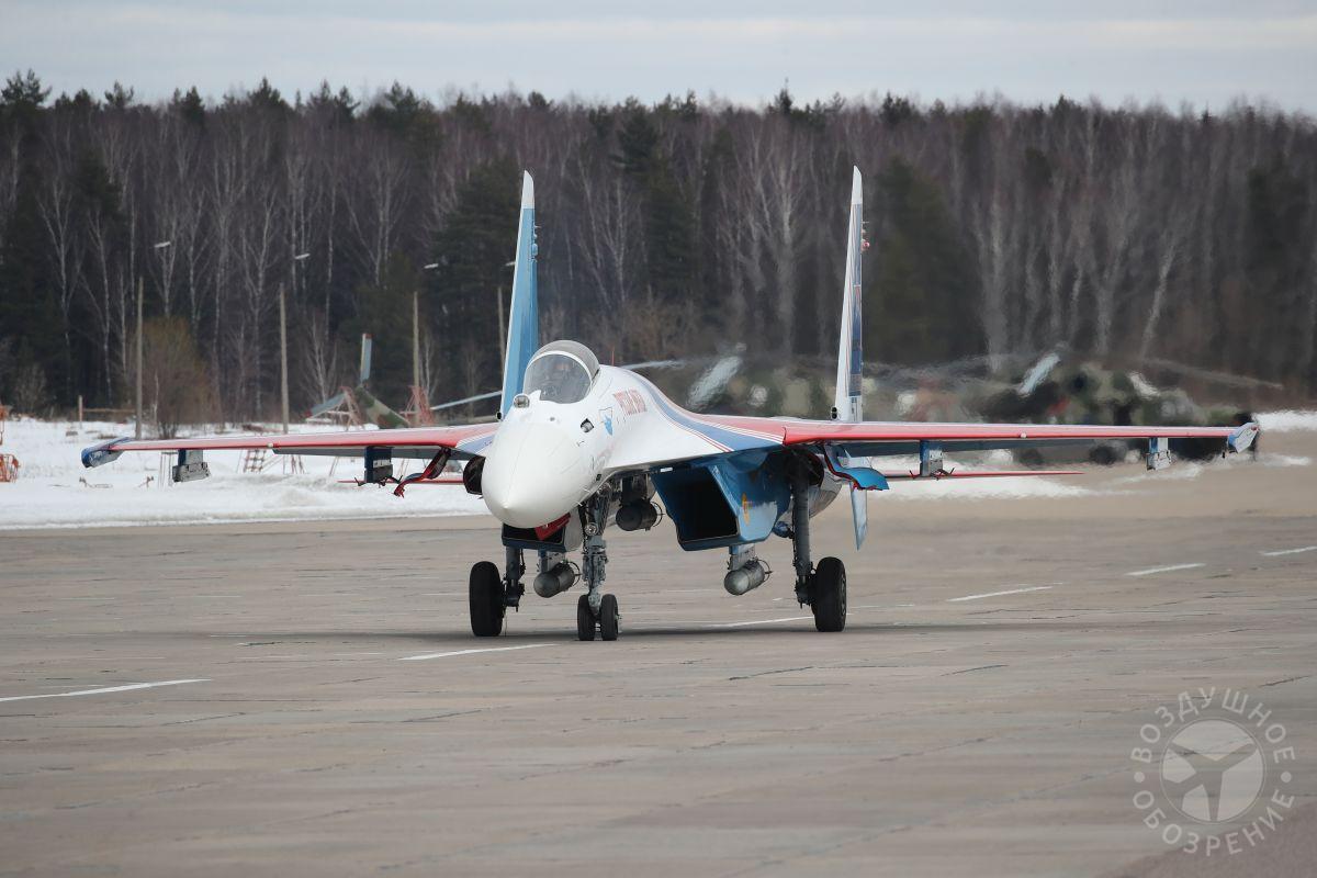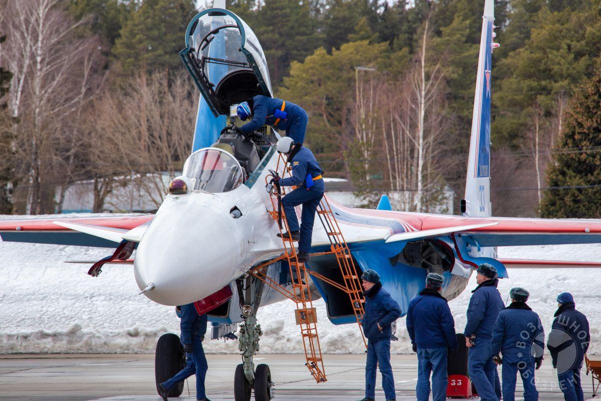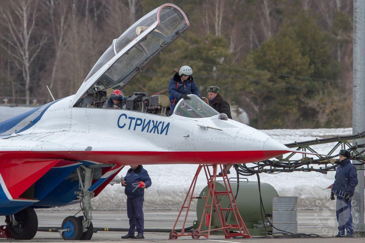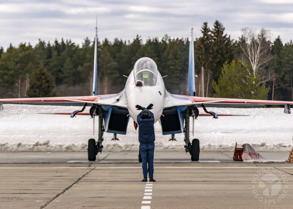 На аэродроме Кубинка прошли плановые полёты экипажей авиационных групп высшего пилотажа «Русские Витязи» и «Стрижи», входе которых лётчики отработали практические пуски управляемых ракет «Воздух-Воздух».