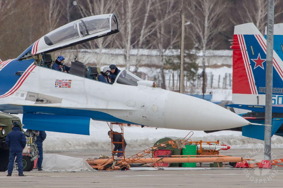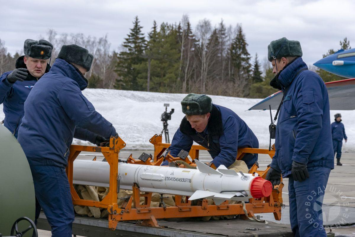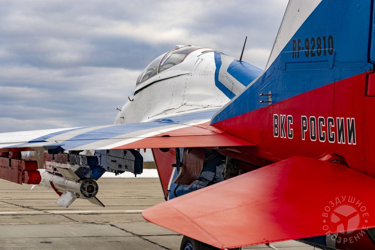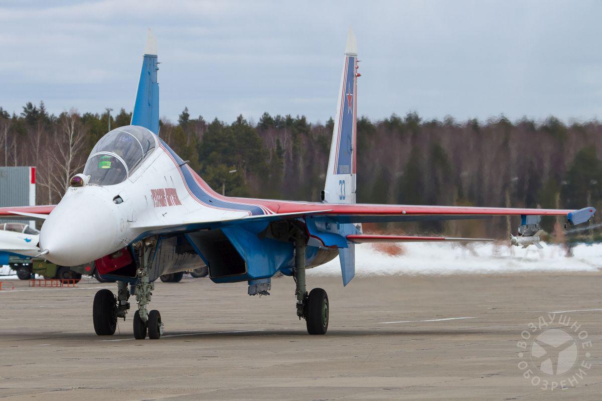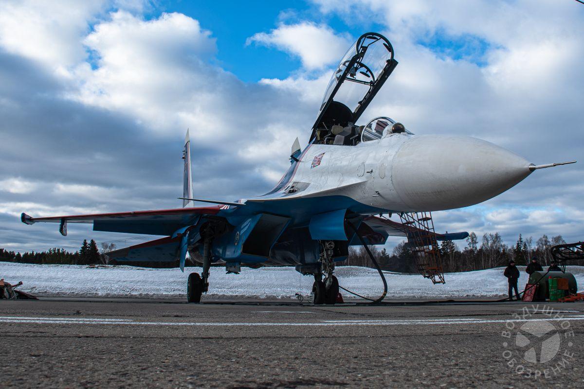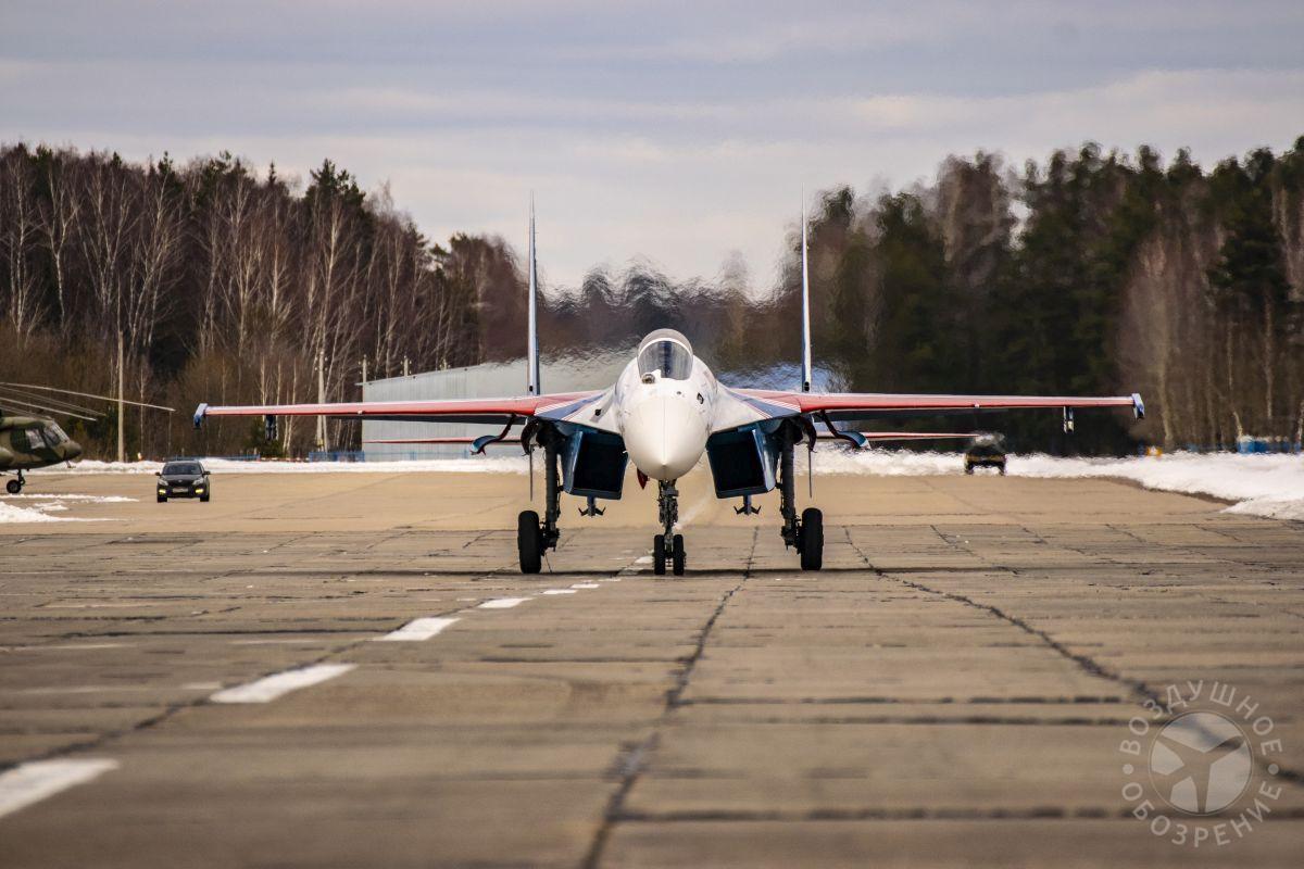 На аэродроме Кубинка прошли плановые полёты экипажей авиационных групп высшего пилотажа «Русские Витязи» и «Стрижи», входе которых лётчики отработали практические пуски управляемых ракет «Воздух-Воздух».
