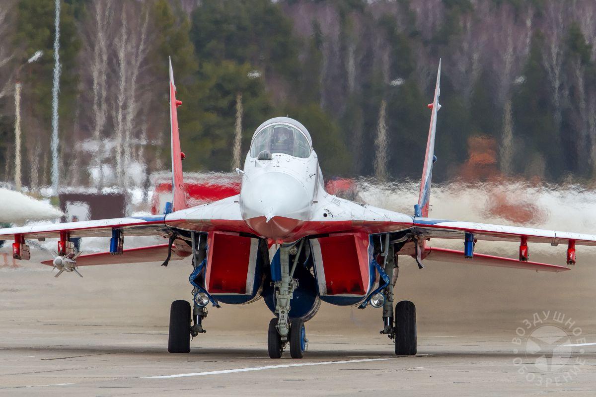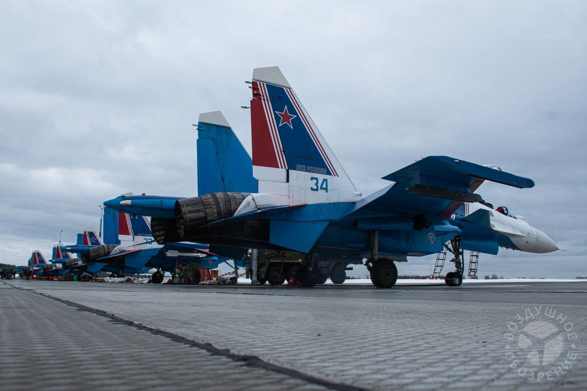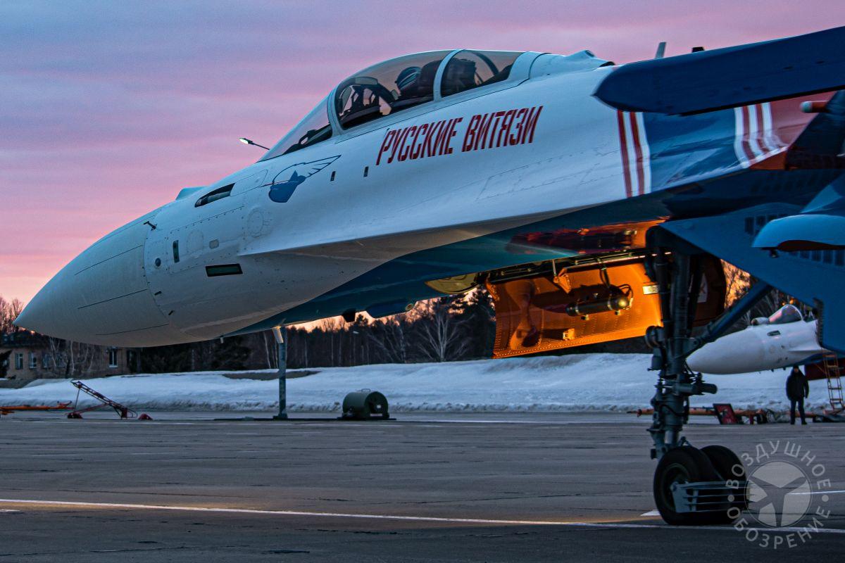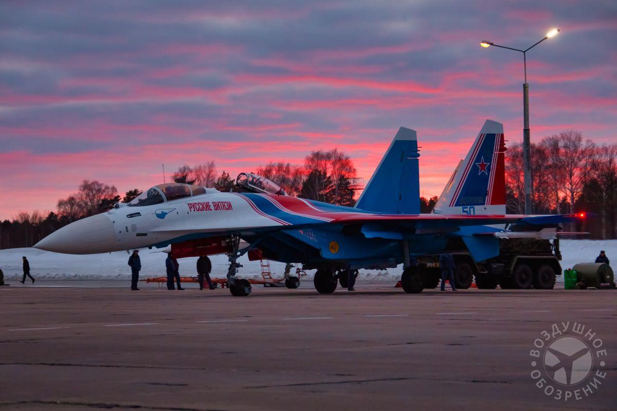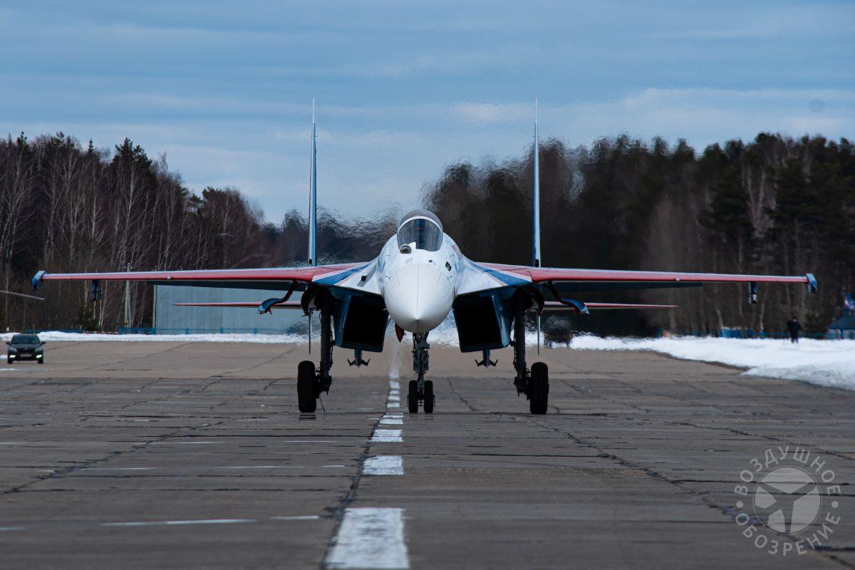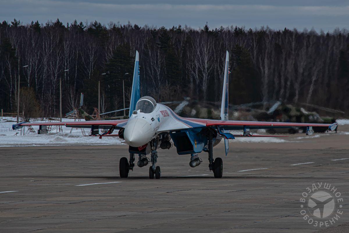 На аэродроме Кубинка прошли плановые полёты экипажей авиационных групп высшего пилотажа «Русские Витязи» и «Стрижи», входе которых лётчики отработали практические пуски управляемых ракет «Воздух-Воздух».