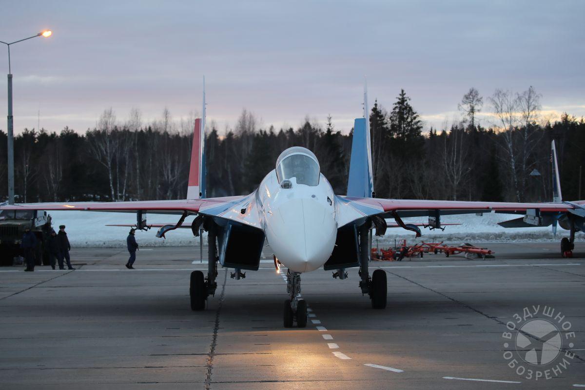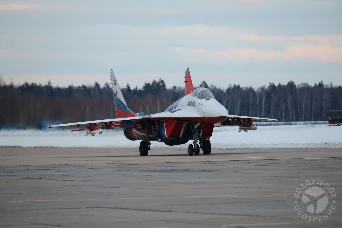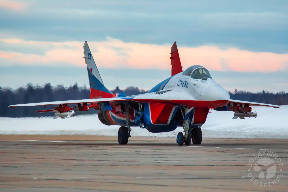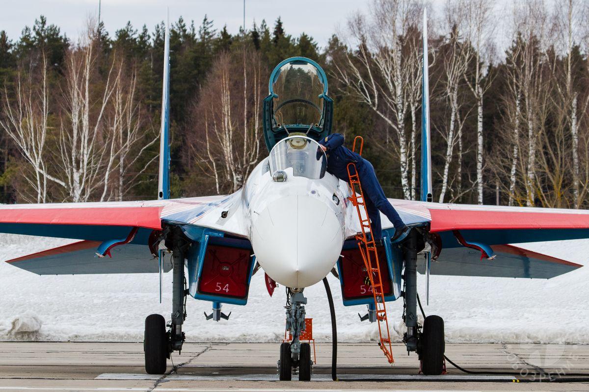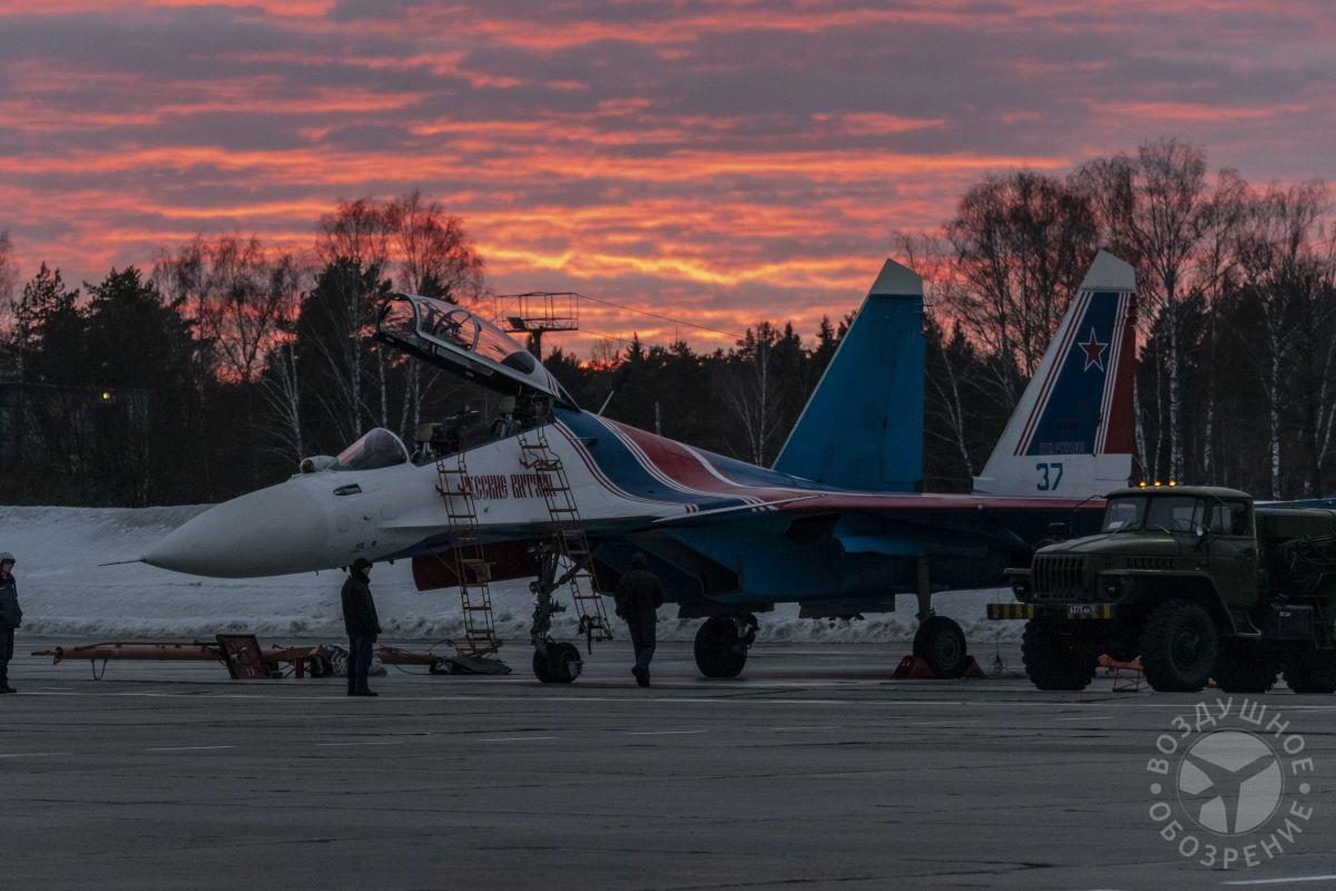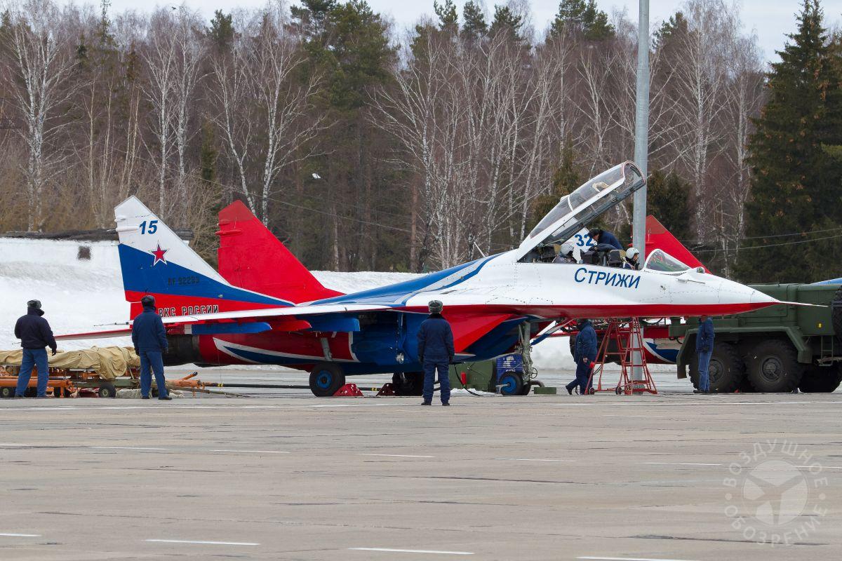 На аэродроме Кубинка прошли плановые полёты экипажей авиационных групп высшего пилотажа «Русские Витязи» и «Стрижи», входе которых лётчики отработали практические пуски управляемых ракет «Воздух-Воздух».