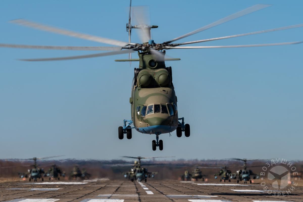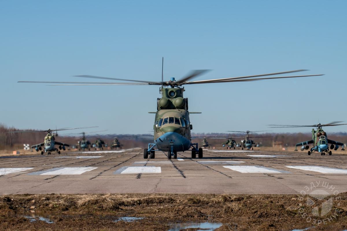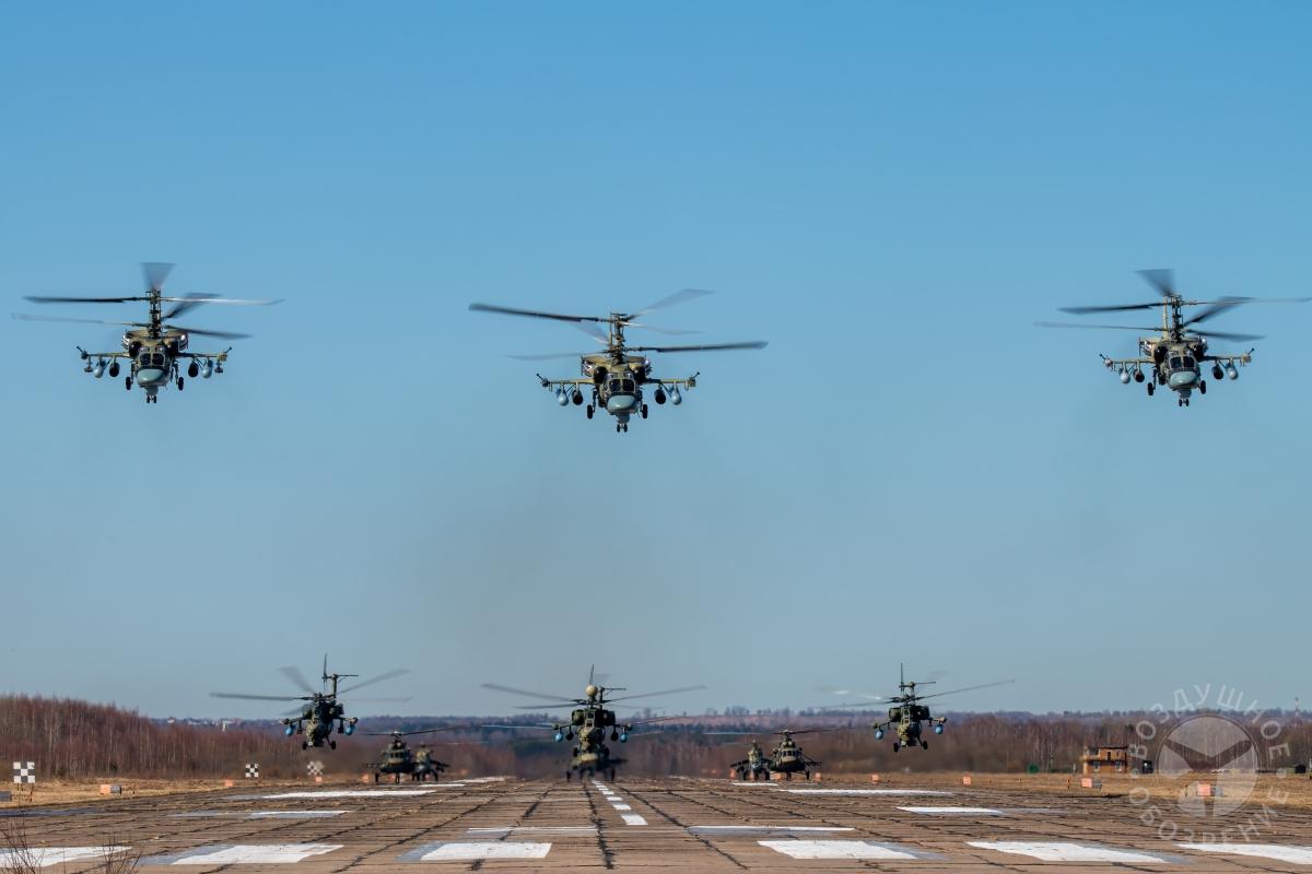 Открывал воздушную часть парада самый большой транспортный вертолет Ми-26 в сопровождении ударных вертолетов Ми-24. За ним проследовали группы вертолетов армейской авиации ВКС Ка-52, Ми-28н, Ми-8 и Ми-24.