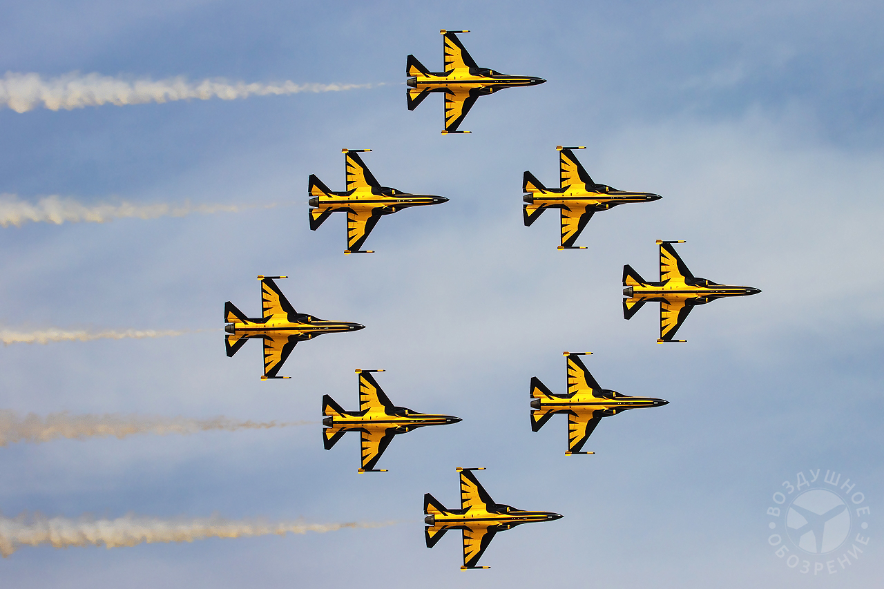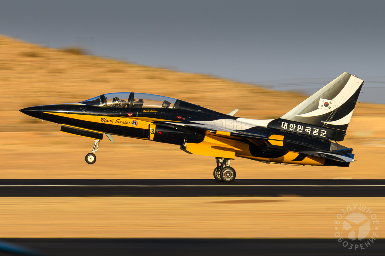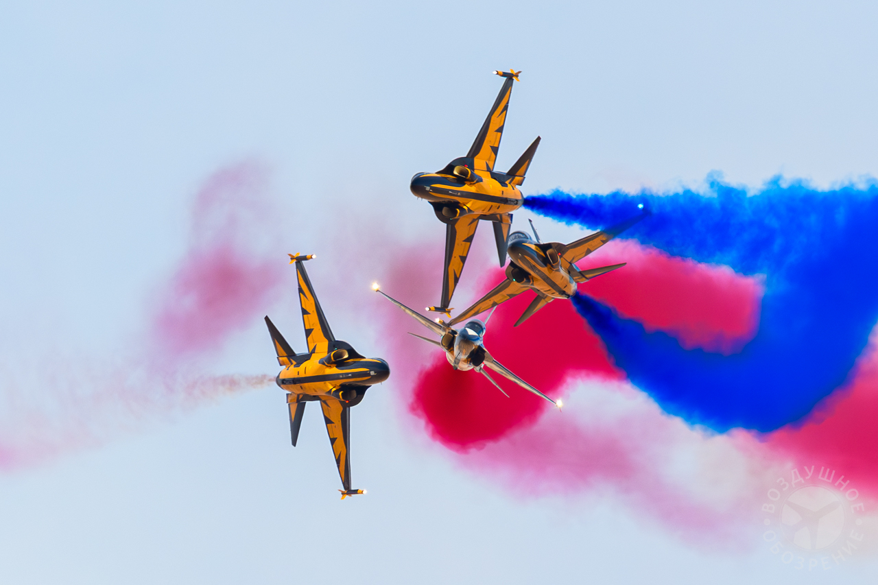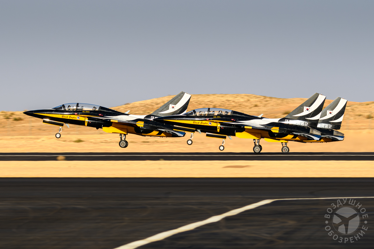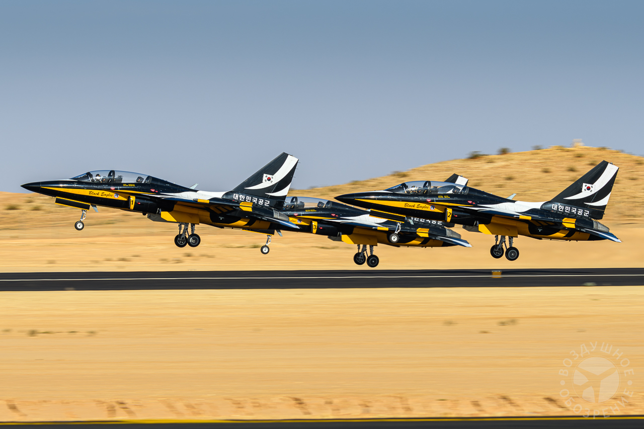 Еще одним ярким участником лётной программы выставки World Defense Show 2026 стала южнокорейская пилотажная группа Black Eagles. Пилоты команды, представляющей ВВС Южной Кореи, выступают на учебно-боевых самолетах KAI T‑50B. Эти машины отличаются высокой маневренностью и специально адаптированы для выполнения сложных групповых фигур пилотажа. Во время демонстрации над выставочной зоной развернулась полноценная пилотажная программа. Восемь самолетов в плотном строю выполняли синхронные развороты, «петли», расхождения на высокой скорости и сложные зеркальные манёвры. Особый эффект создавали дымовые следы белого, синего и красного цветов, которые оставляли самолеты, формируя в небе фигуры и линии.