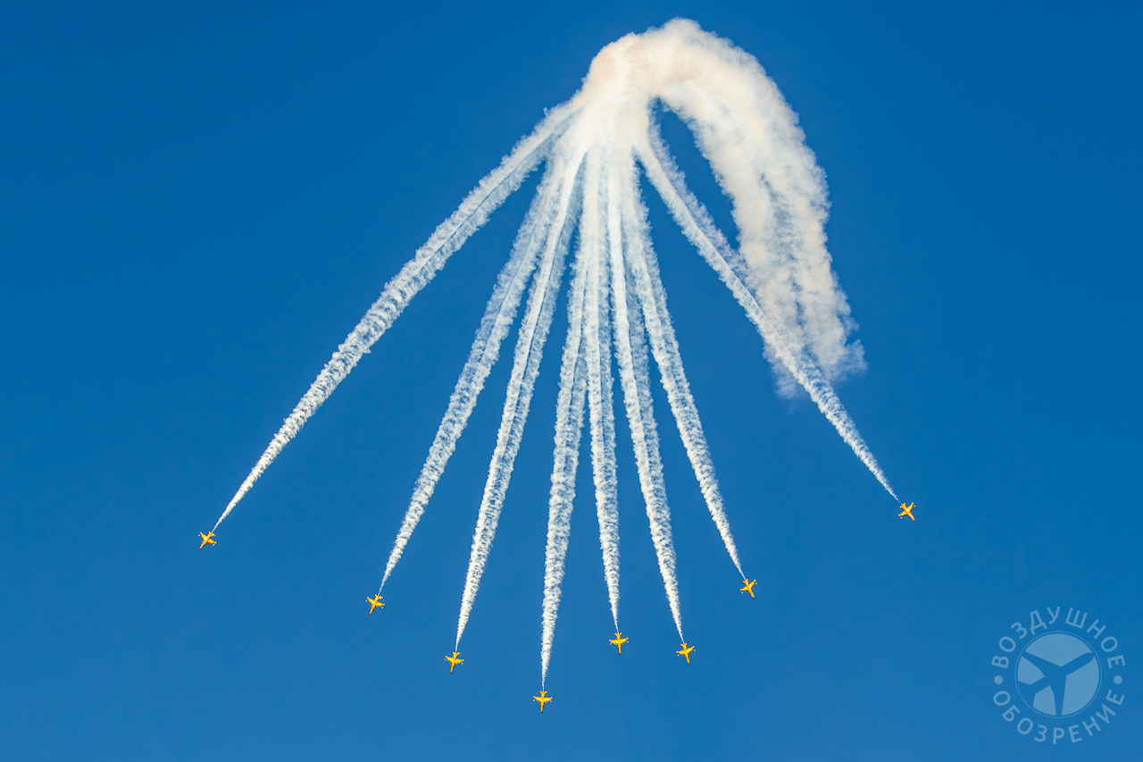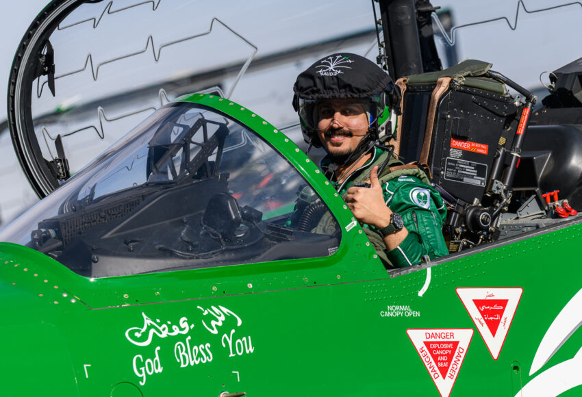 Кроме того, важным и безусловно красочным элементом авиационной программы стали показательные выступления пилотажных групп. Одним из самых ожидаемых участников была саудовская пилотажная группа Saudi Hawks, выступающая на учебно-боевых самолетах Hawk T-165. Их выступление сопровождалось сложными групповыми фигурами пилотажа и традиционными дымовыми следами в цветах национального флага.