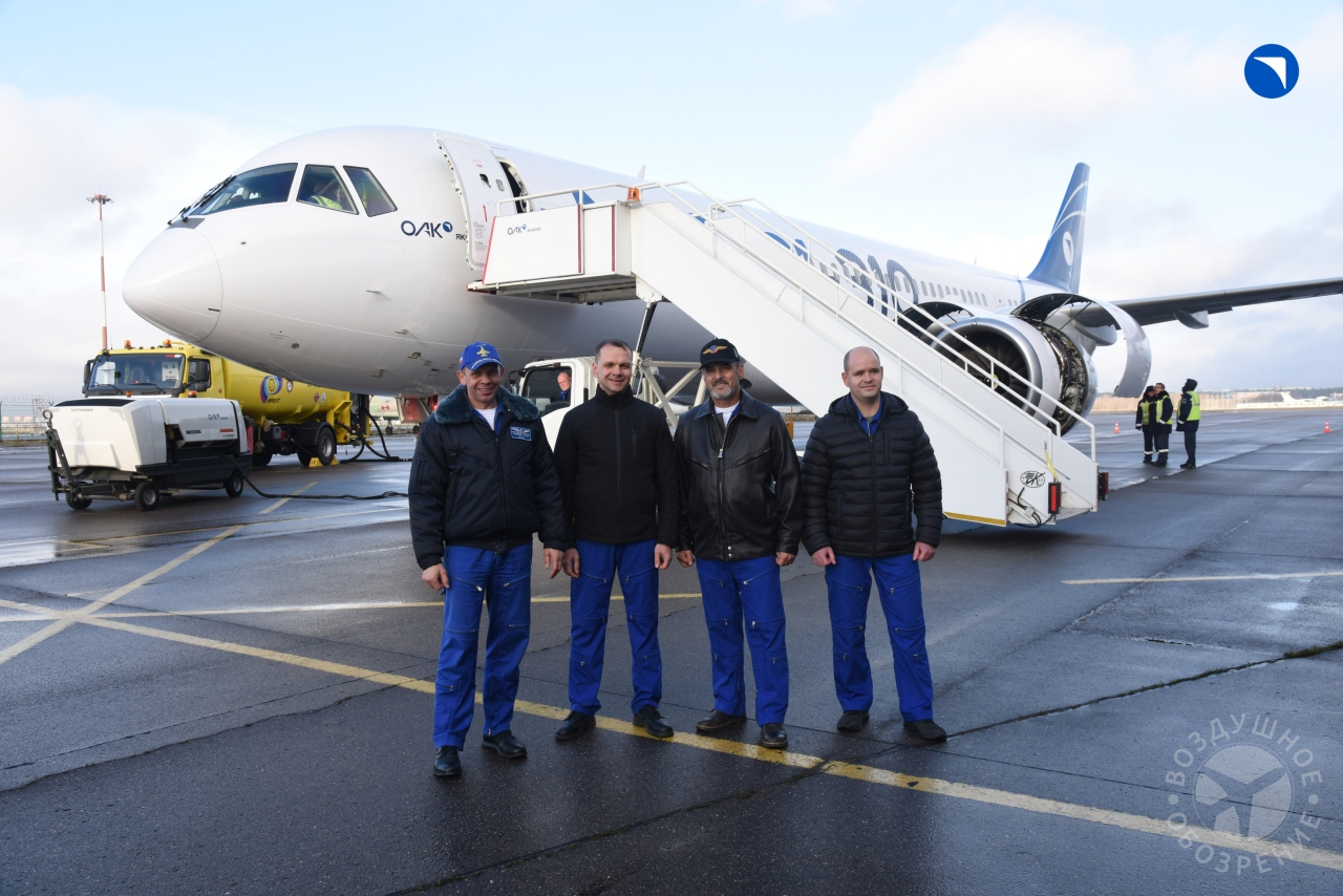 Самолет пилотировал экипаж в составе летчиков-испытателей Андрея Воропаева и Олега Мутовина, а также ведущих инженеров по летным испытаниям – бортовых операторов Антона Кузнецова и Григория Кудряшова. Время полета составило 6 часов 15 минут, он проходил на высоте около 11 000 м со скоростью 800 км/ч.