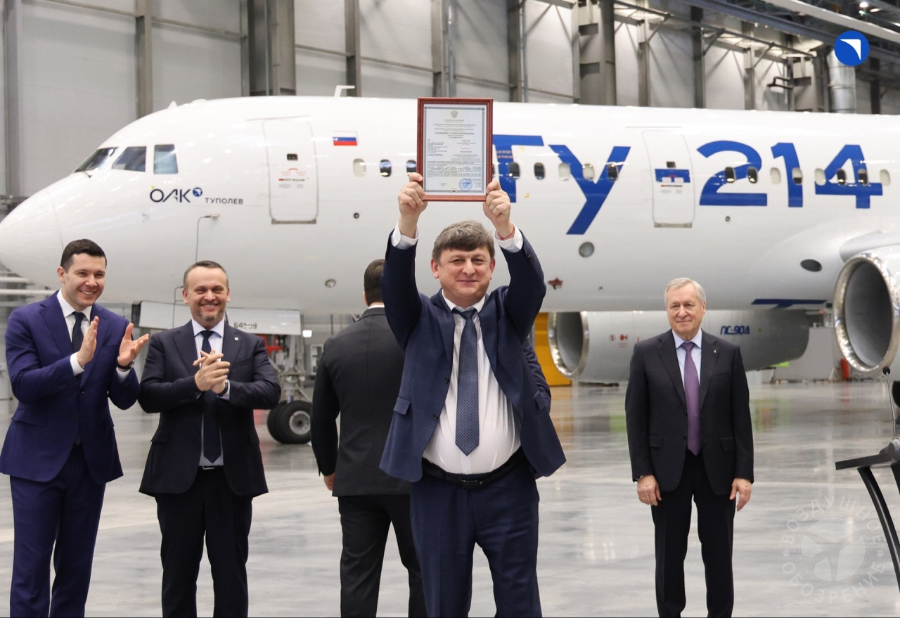 Документ первому заместителю управляющего директора АО «Туполев» – директору КАЗ им. С.П. Горбунова (входит в ОАК Госкорпорации Ростех) Зуфару Миргалимову вручил Руководитель Федерального агентства воздушного транспорта Дмитрий Ядров. На торжественной церемонии присутствовали Раис Татарстана Рустам Минниханов, глава Минпромторга РФ Антон Алиханов, Министр транспорта РФ Андрей Никитин, представители поставщиков-производителей новых систем самолета и другие официальные лица.